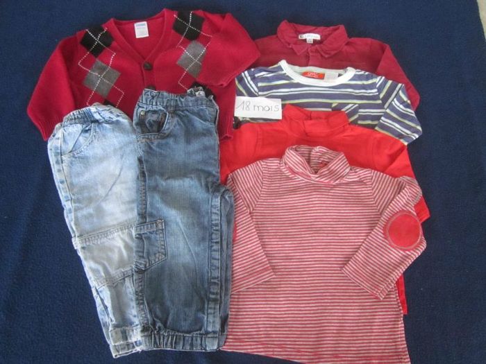18m, 4 hauts ml + gilet + 2 jeans (le clair a le bas élimé), vert baudet, okaou, gymborée