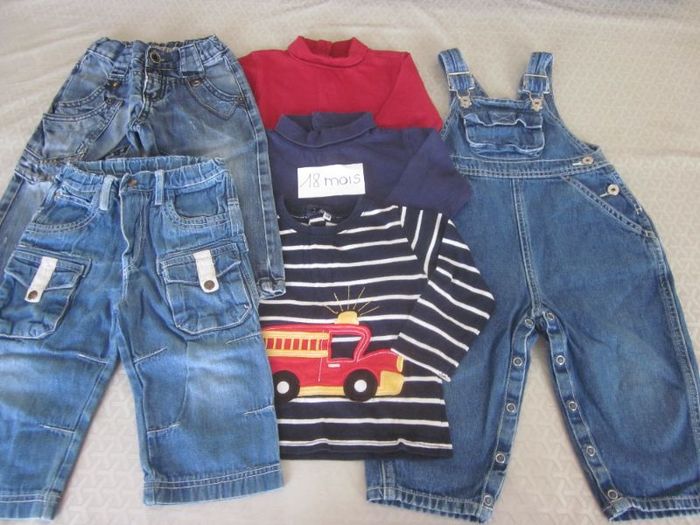18m, salopette jean + 3 hauts ml + 2 jeans, boutchou, kimbaloo, boite à malices