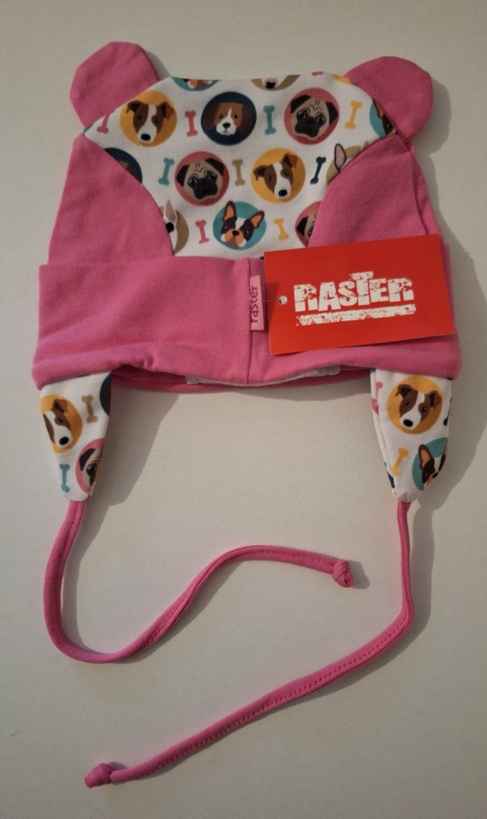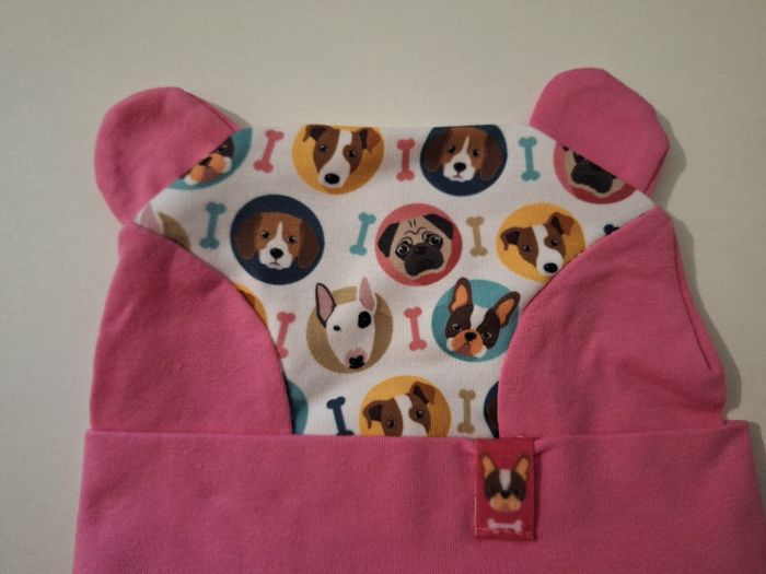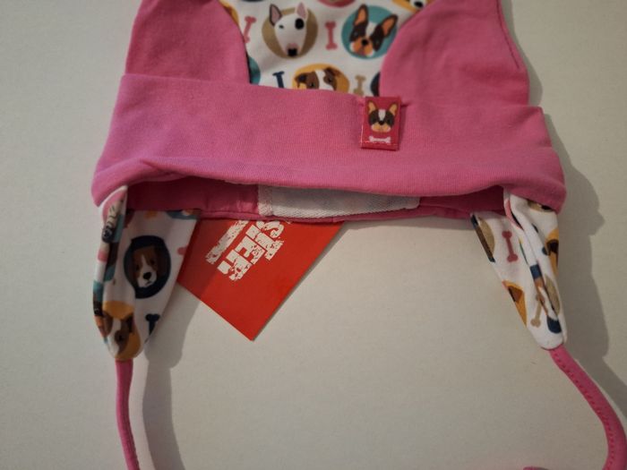 Jolie chapka rose à petites oreilles imprimée têtes de chiens. Liens à nouer sous le cou. Pattes qui descendent bien sur les oreilles de l'enfant. Tour de tête : 42/44 cm. En coton, polyester et élasthanne.