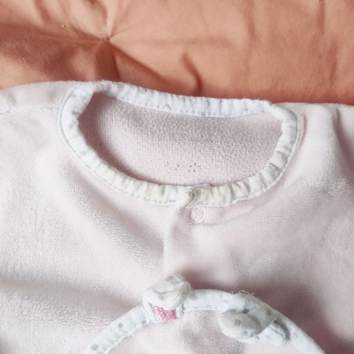 Pyjama en velours pour bébé fille en taille 3 mois. Matière très douce. Tache jaune à l'encolure. Pressions ok. Couleur rose clair. Maison non fumeur. Compter un délai d'envoi après validation de la commande.