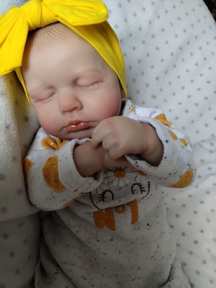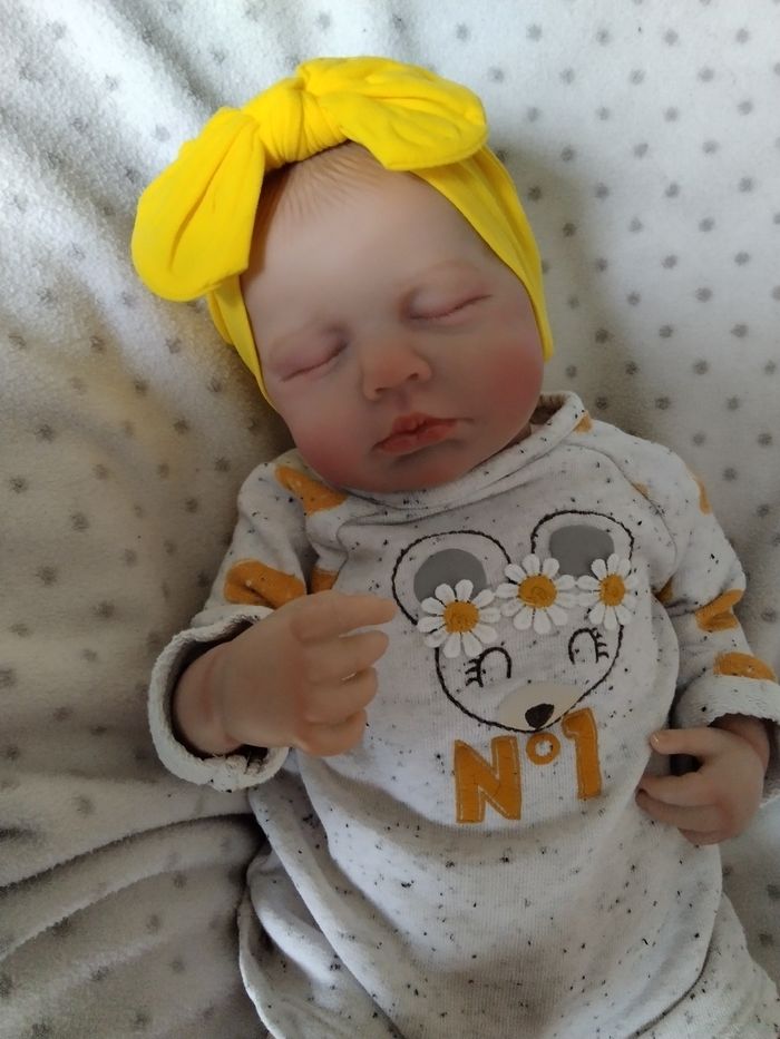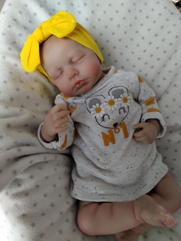Bébé reborn de 48 cm pour 2 kilos 280 Sa tête tombe légèrement comme un vrai bébé Son corps est en tissu et ses membres en vinyle Il est très agréable à porter Il porte du 1 mois Sa bouche est aimantée Il est vendu avec les vêtements et accessoires des photos ainsi qu'un joli petit trousseau Sa jumelle est également disponible dans mon dressing