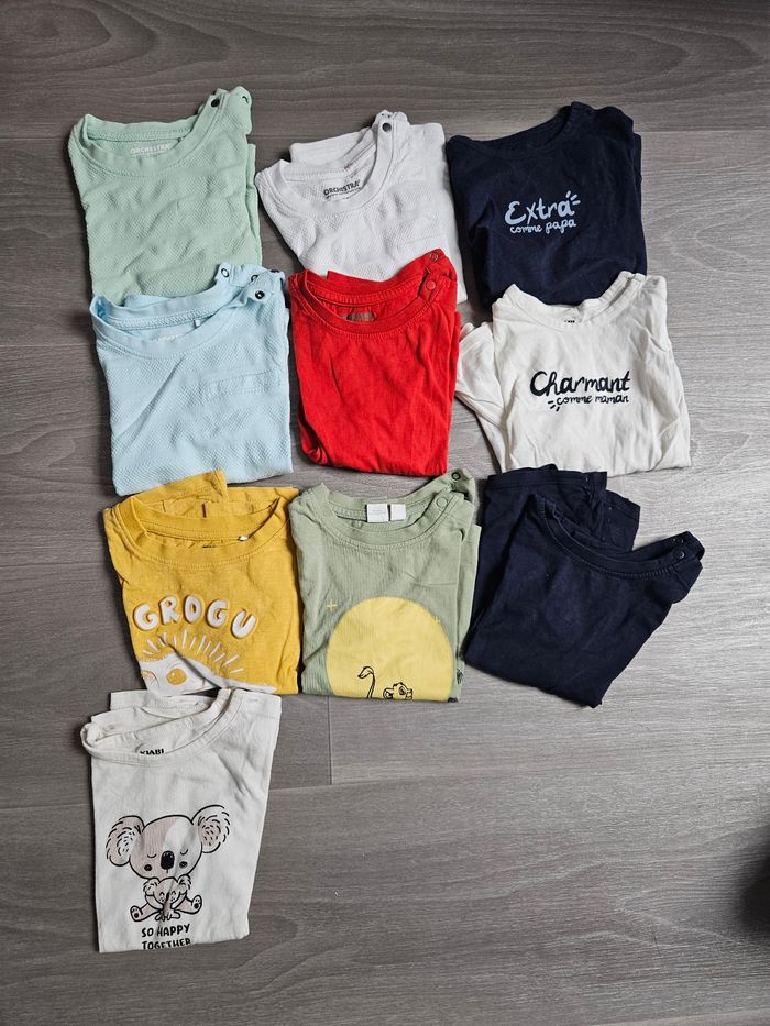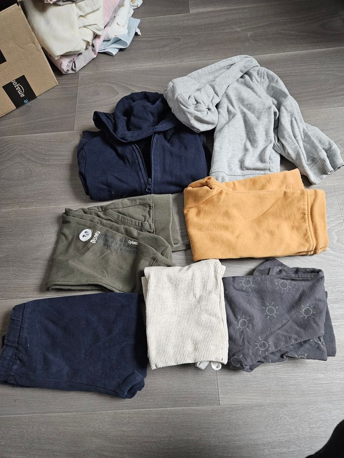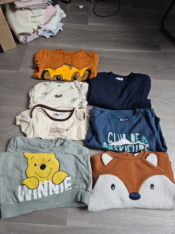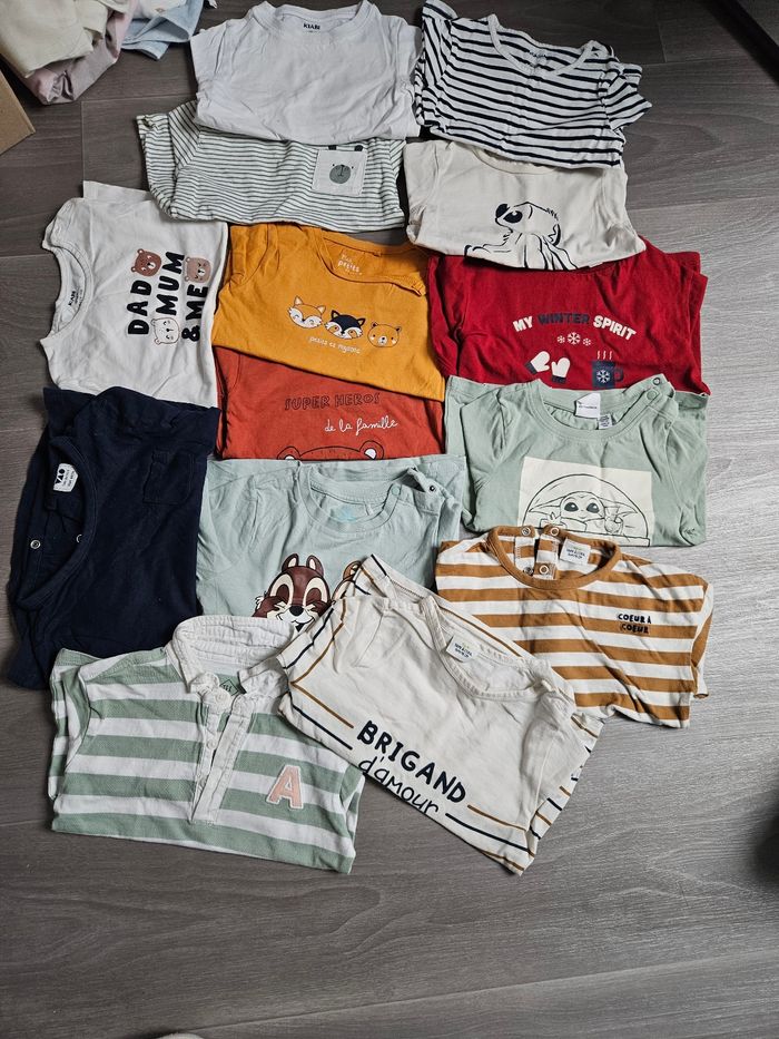 Bonjour je vend des vêtements bébé garçon en lots 36 mois Plusieurs marque 15 pyjamas / 10 tee shirts manche courte / 5 pull/ 2 body / 5 pantalon / 2 vestes capuche / 14 tee shirts manche longue / 3 salopettes