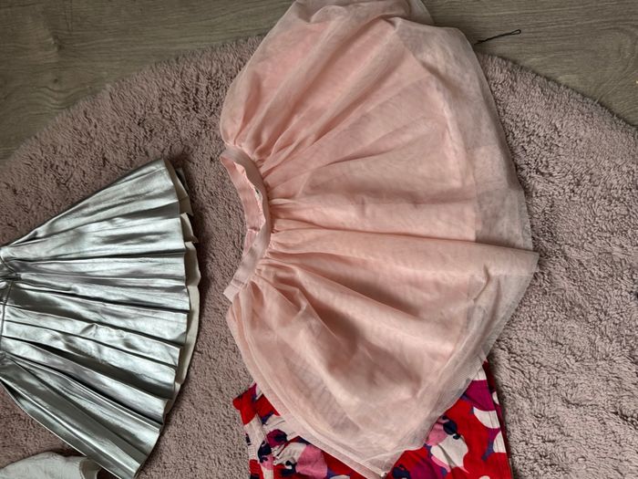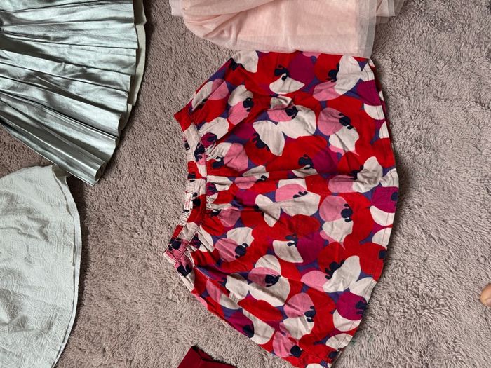 Bonjour Lot de vêtements fille 8 ans 7 pièces Jeans okaidi Jupe plissée argentée Kiabi Jupe tulle h&m taille 6-8 ans à signaler j ai rajouté un point à la taille car ell était un peu large Jupe short rouge et une autre fleurie tape à l’œil Short en velours cyrilus