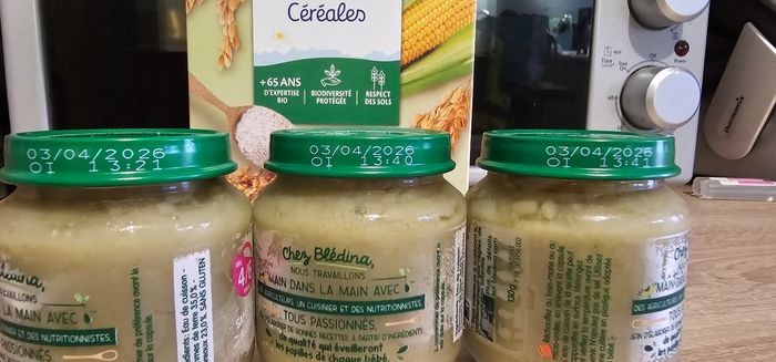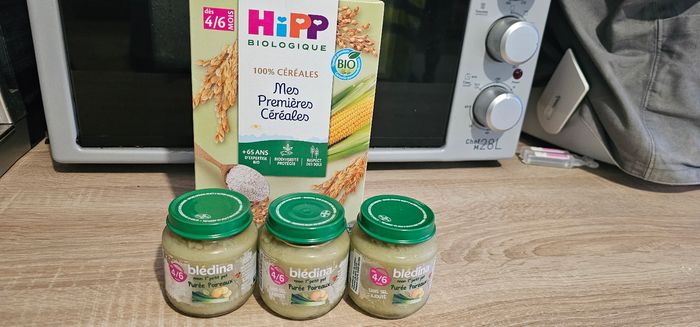 3 petit pot 4/6mois purée de poireau Et un paquet de céréales sans gluten