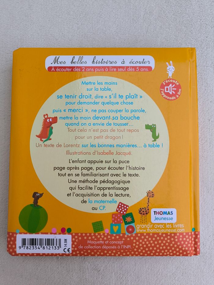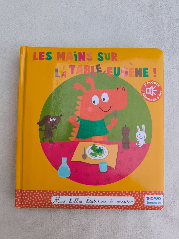 Livre sonore Mes belles histoires à écouter : Les mains sur la table, Eugène ! Éditions Thomas Jeunesse À écouter dès 2 ans, à lire dès 5 ans • Pages cartonnées • J'écoute, j'apprends à lire • Les bonnes manières -> Dragons • Intérieur du livre en très bon état • Coins légèrement abîmés Fonctionne Piles non incluses En très bon état #evelyne_livres