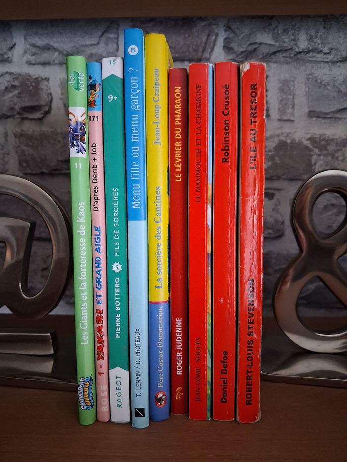 ✏️ Yakari et Grand Aigle Derib et Job Très bon état ✏️ Skylanders Universe Les Giants et la forteresse de Kaos Bon état La bibliothèque verte Edition Hachette Jeunesse ✏️ Fils de Sorcières Pierre Bottero Edition Rageot Bon état - couverture marquée ✏️ Menu fille ou menu garçon ? Thierry Lenain - Catherine Proteaux Edition Nathan Très bon état ✏️ La sorcière des cantines Jean-Loup Craipeau Mathieu Blanchin Père Castor Edition Flammarion Très bon état ✏️ La mammouth et la châtaigne Jean-Côme Noguès Edition Lire c’est partir Très bon état ✏️ Le lévrier du Pharaon Roger Judenne Edition Lire c’est partir Très bon état OFFERTS ✏️ Robinson Crusoé Daniel Defoe ✏️ L’île au trésor Robert Louis Stevenson 7 livres + 2 offerts Livraison acceptée Ou remise en main propre possible sur Paris, Bibliothèque François Mitterrand, Gare de Lyon, Etampes