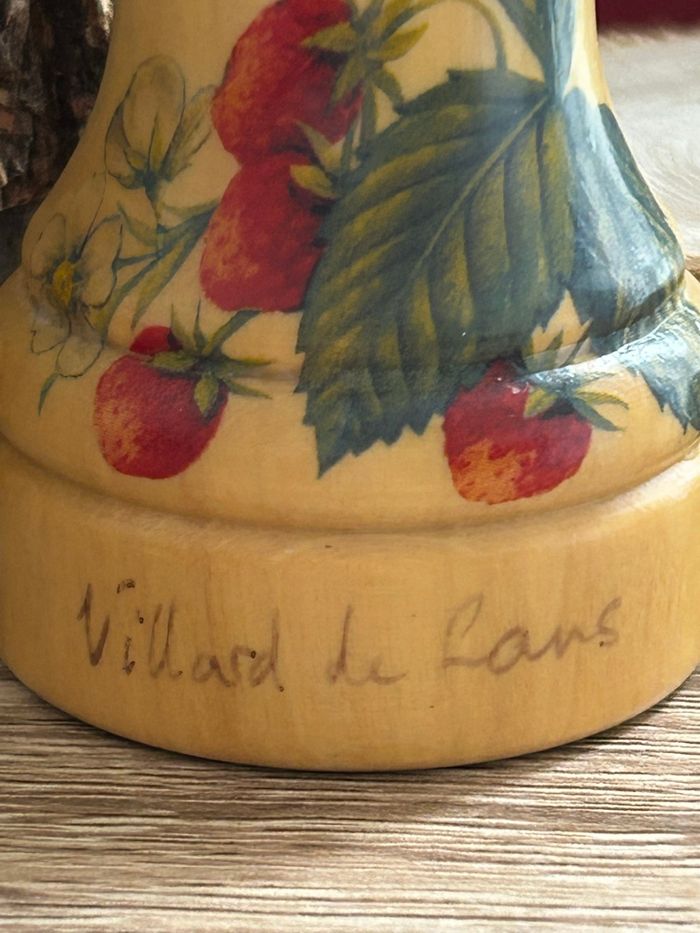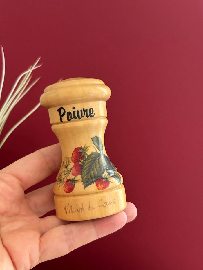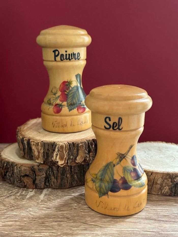 Ensemble de salière et poivrière ce lot est neuf, en bois vernis annotation manuelle ; « Villard-de-Lans » .Décors baies ; fraises et myrtilles Dimensions : hauteur 8,5cm, diamètre 4,5 cm. Remise en main, propre possible à Chartres, secteur cathédrale ou envoi rapide et très soigné.