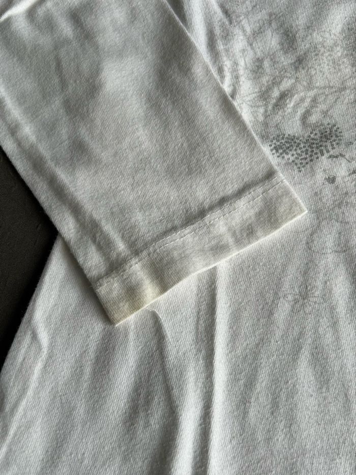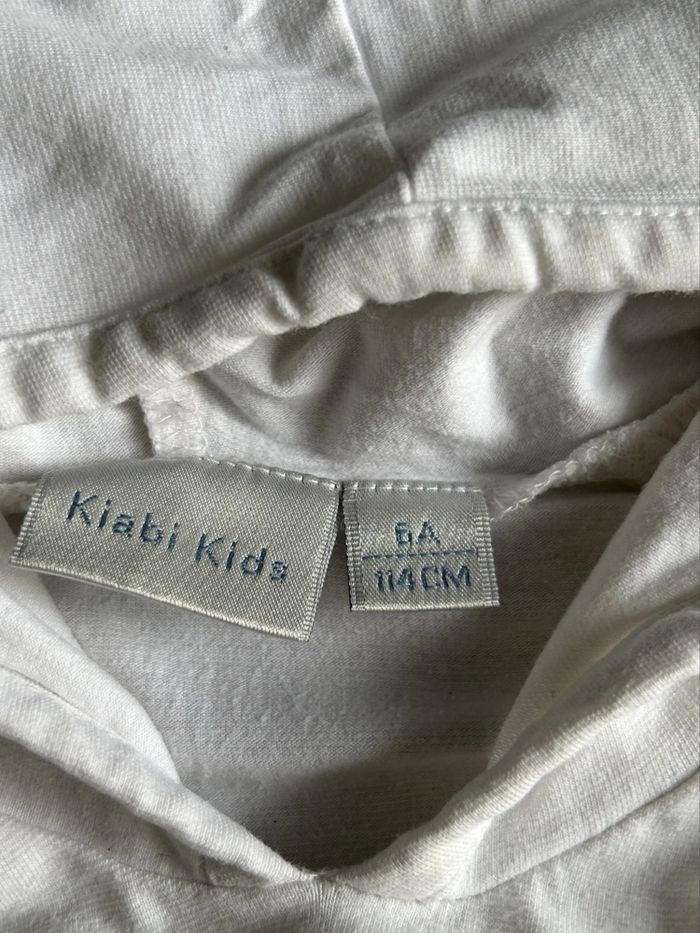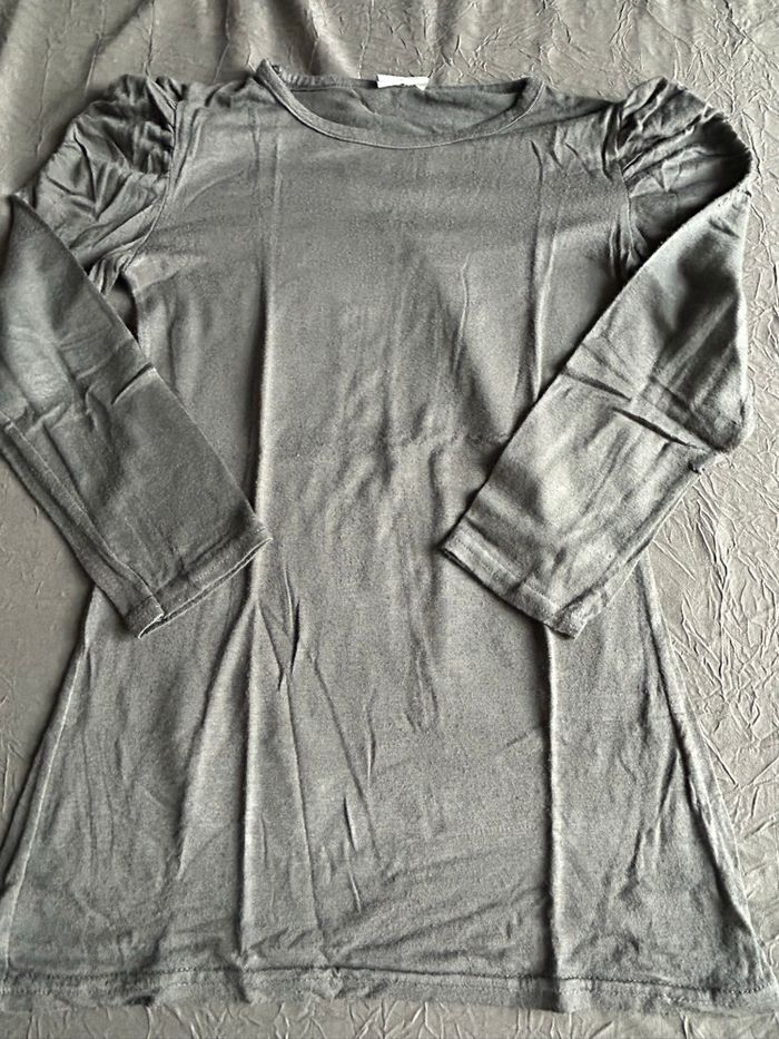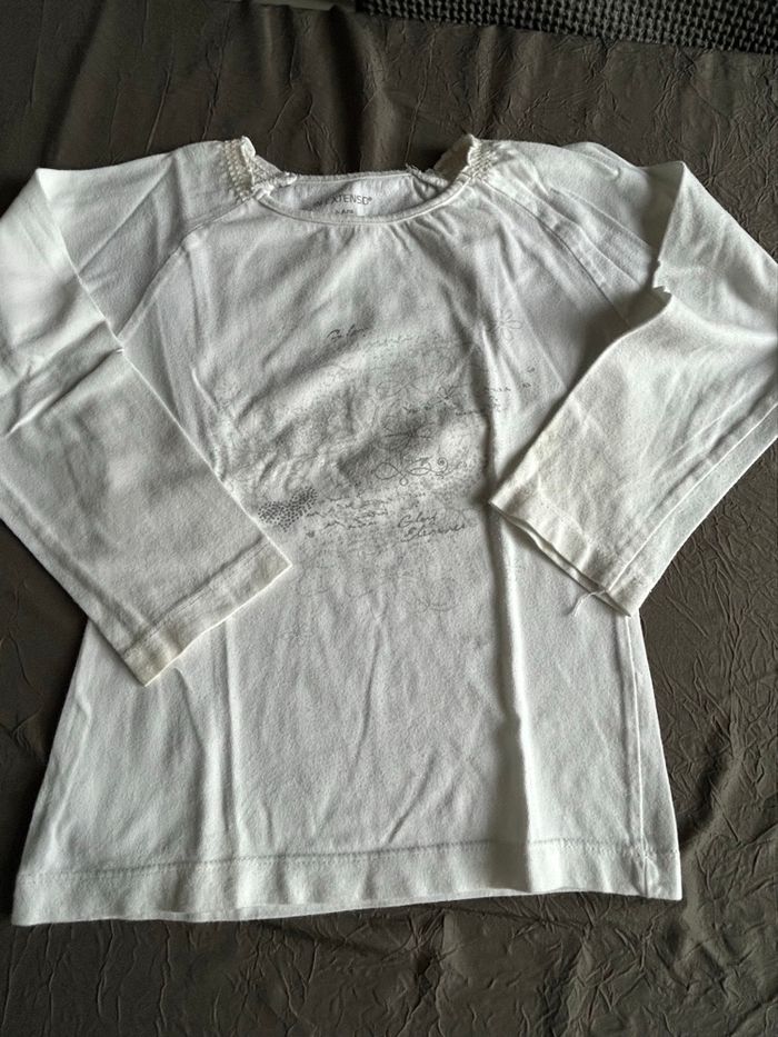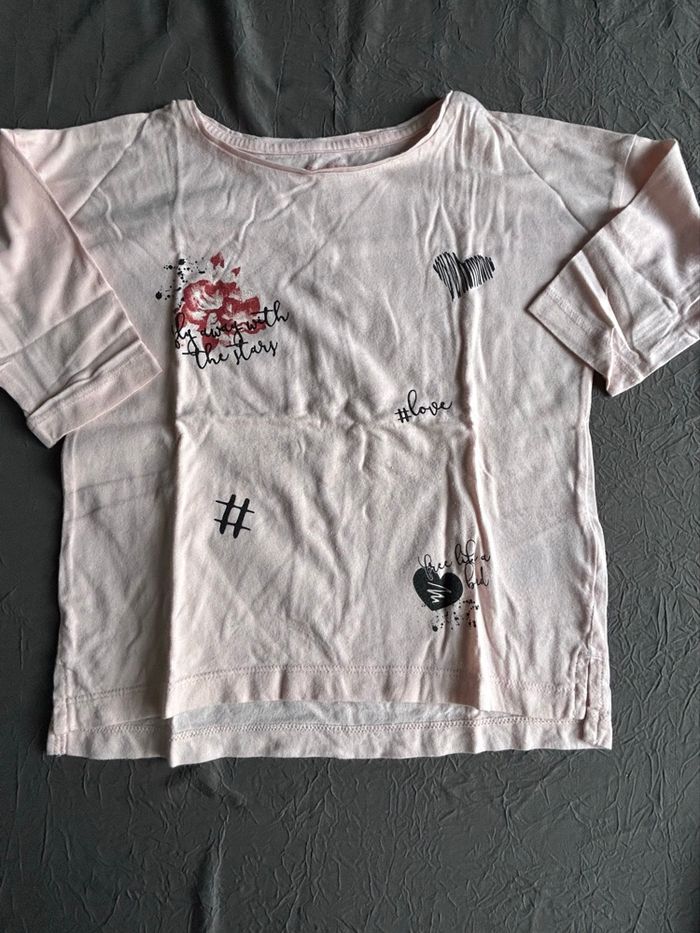 lot de 6 t-shirts fille à manches longues. Taille 6 ans. -1 blanc avec motifs écritures turquoise et saumon devant. Forme sweet à capuche. De la marque « Kiabi ». -1 gris anthracite uni, avec épaule bouffante. Forme tunique longue, idéal sur un legging par exemple. -1 blanc avec motif papillon devant, en sequins or. De la marque « Gemo ». Tissu un peu bouloché. -1 rayé blanc et brun taupe clair, de la marque « Vertbaudet ». En très bon état. -1 -1 blanc avec motifs florales gris clair devant, de la marque « In Extenso ». -1 rose poudré, manches 3/4, avec motifs écritures noires et fleurs rose sur le devant. Taille 4-6 ans de la marque « Lupilu ». En excellent état. Ils ont été portés mais peuvent encore largement faire usage.