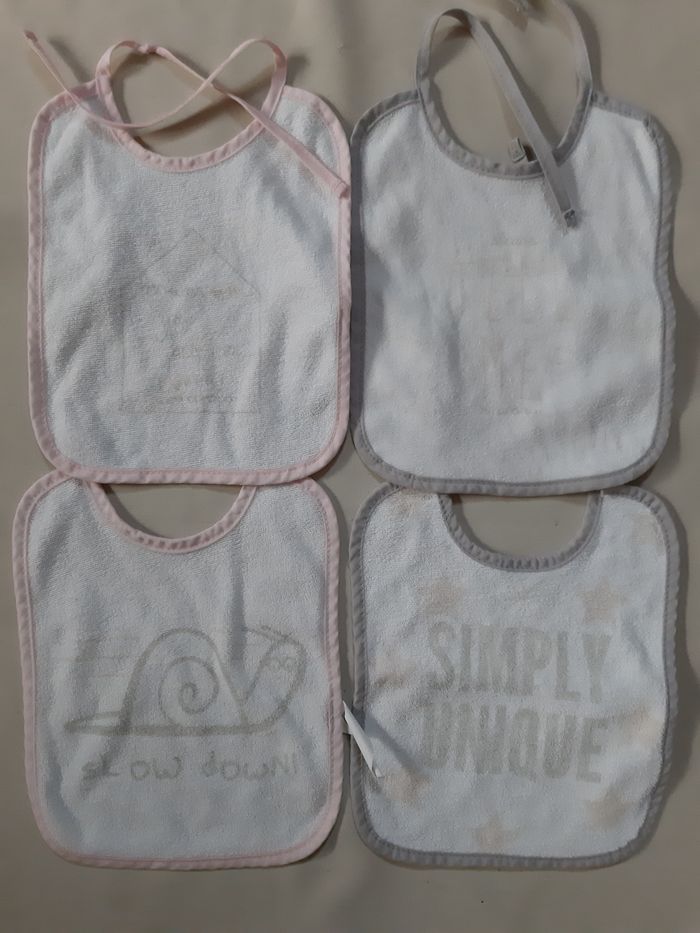 lot de 4 bavoirs, de la marque Tex En bon état. 📦 Envoi possible. 🛍 Remise en main propre possible dans le secteur de Pont-Audemer, Beuzeville, Epaignes, Pont-L'évêque. 🏷 jusqu'à 15 % de réduction pour l'achat de plusieurs articles. N'hésitez pas à faire un lot pour amortir les frais de port et les frais de protection acheteur. 📦 😊 Vêtements de la taille naissance à la taille 6 ans disponibles. Jouets et livres disponibles. N'hésitez pas à me demander. Tout n'est pas encore en ligne...