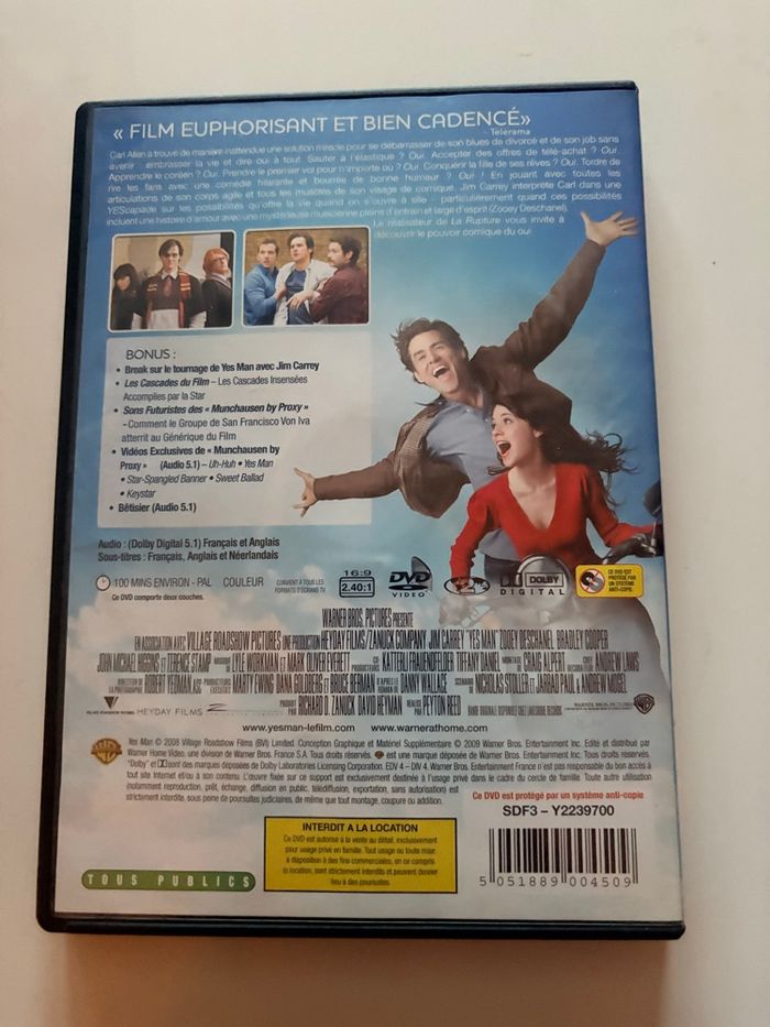 🎬 DVD YES MAN – Jim Carrey – Comédie – Tous publics 🎬 DVD du film Yes Man avec Jim Carrey, une comédie culte drôle et positive 😂✨ Idéal pour une soirée détente en famille ou entre amis 🍿 📀 Synopsis : Carl Allen dit “non” à tout… jusqu’au jour où il décide de dire OUI à tout ! Sa vie bascule alors dans une succession de situations hilarantes, imprévues et pleines d’émotions 💥😂 Une comédie feel-good portée par l’énergie inimitable de Jim Carrey ❤️ 🔹 Format : DVD 🔹 Genre : Comédie 🔹 Acteur principal : Jim Carrey 🔹 Public : Tous publics 🔹 État : Très bon état 📦 Envoi rapide et soigné 🚭 Maison non-fumeur 🛍️ Réduction sur les lots 📀 Dressing trié par # #dvd #yesman #jimcarrey #comedie #filmculte #touspublics #soireefilm