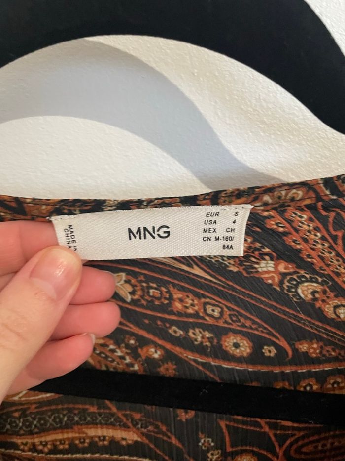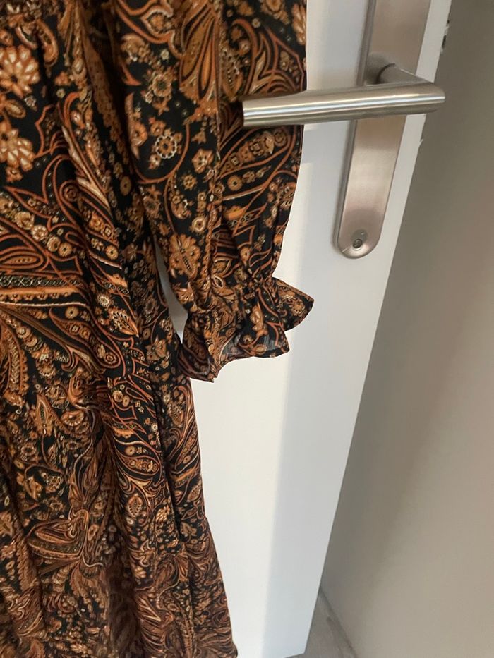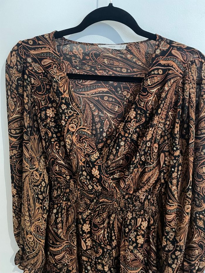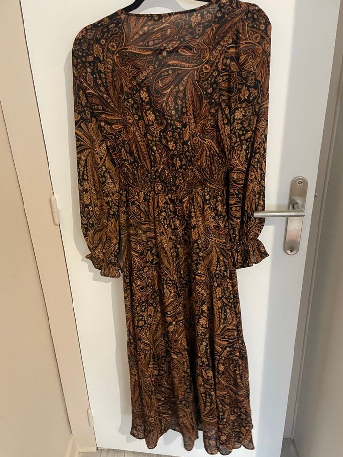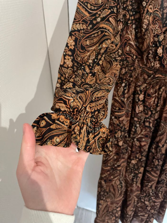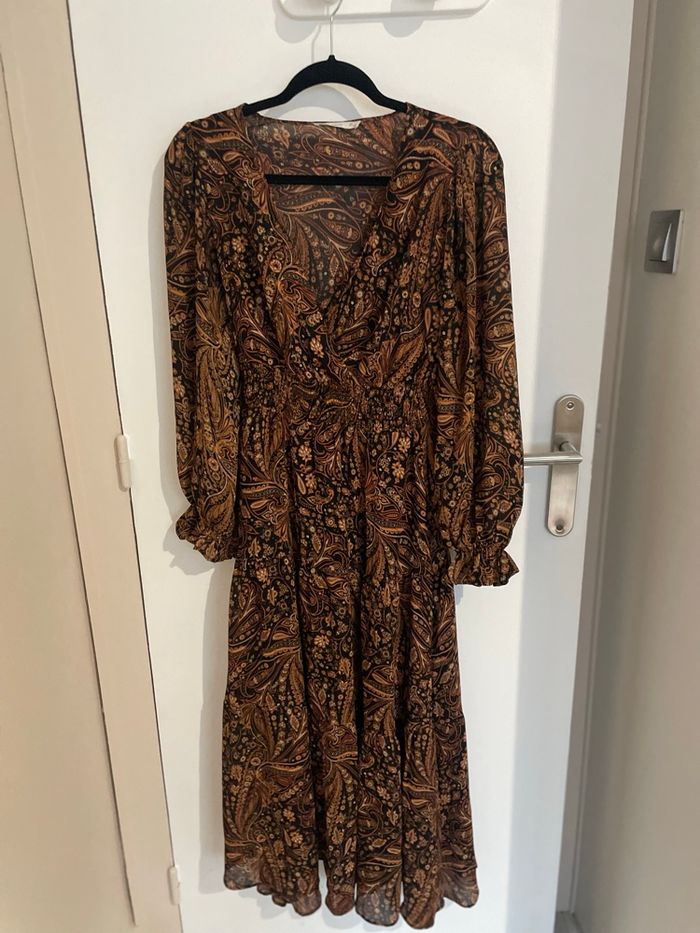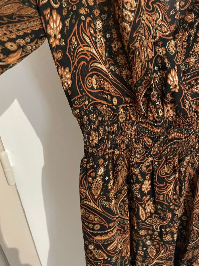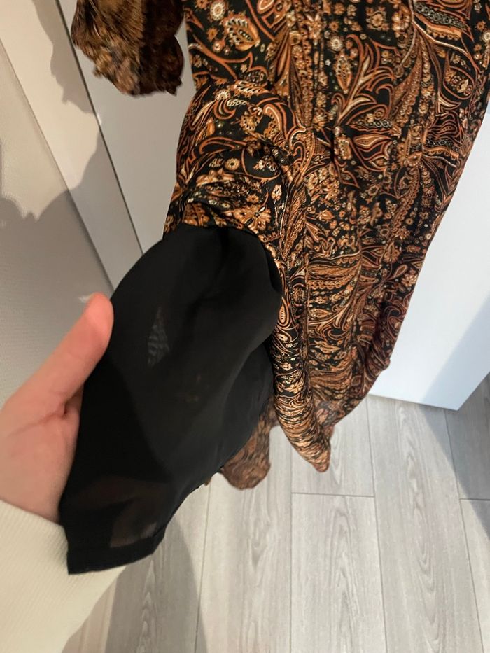 Description : robe longue couleur d’automne avec voilage noir en dessous, partie basse Taille / pointure : S Couleurs : brun noir marron Détails : fleurs automnales Marque : mango Défauts : aucun Peu porté