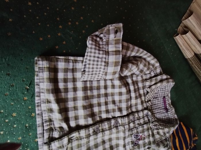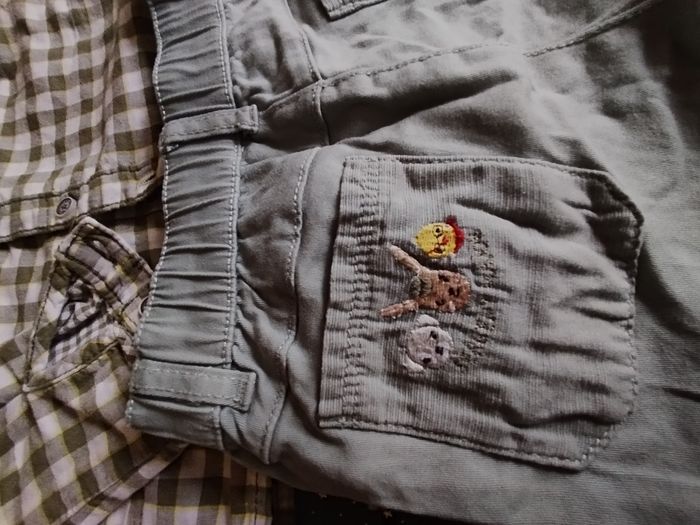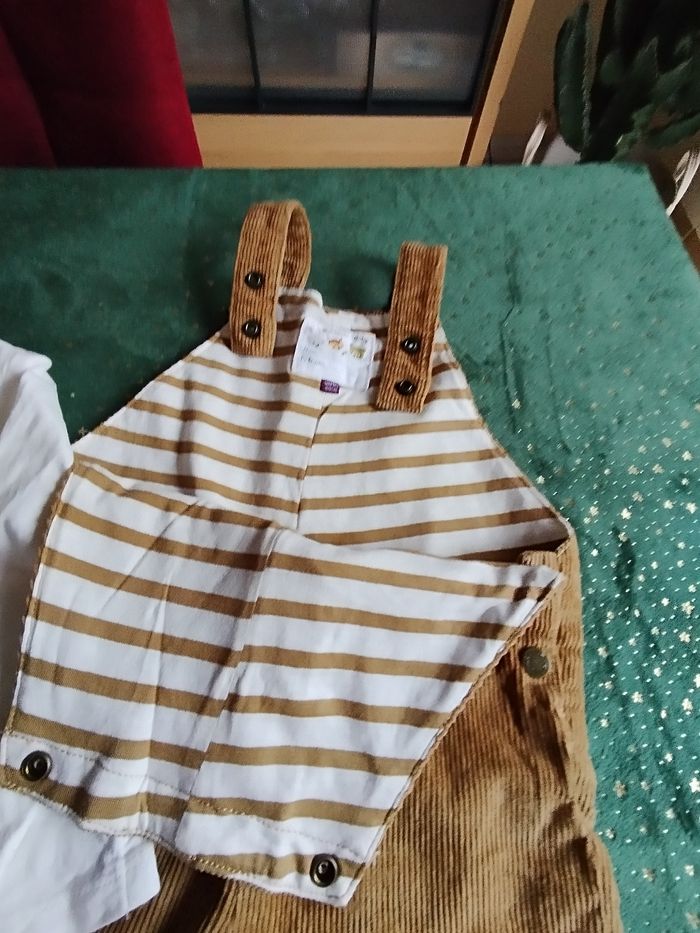 Lot cotte velour camel doublée rayures beige et camel avec polo body intégré fantaisie. Polo manches longues bleu marine et camel coton épais. Tenue pantalon toile vert avec chemise doublée à carreaux. 18 mois garçon