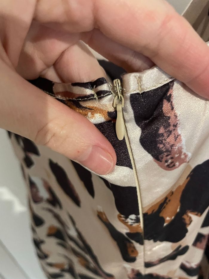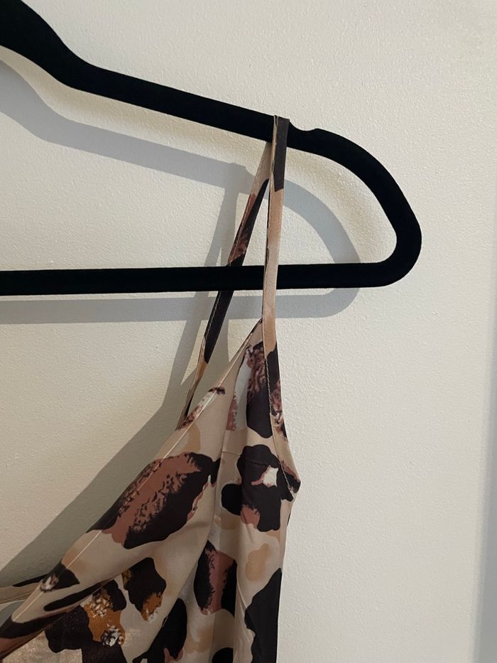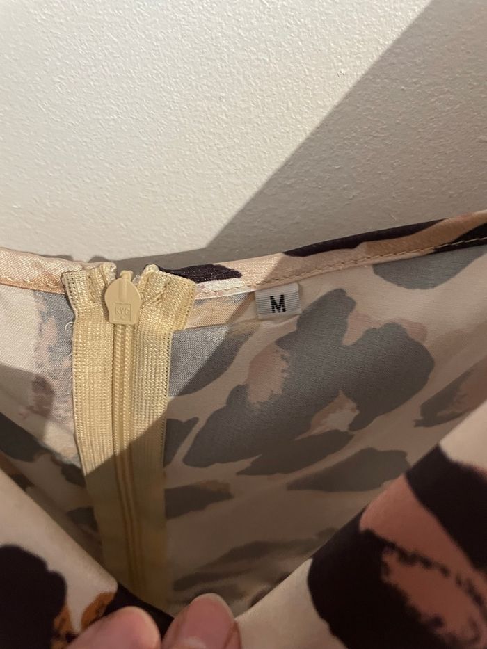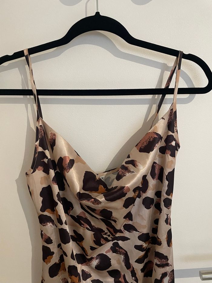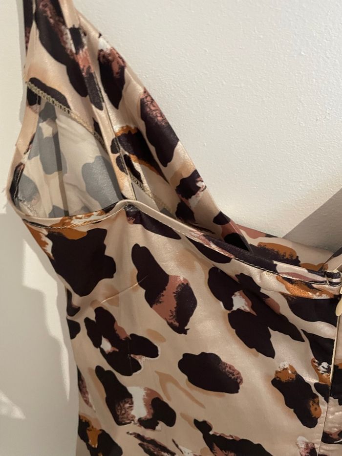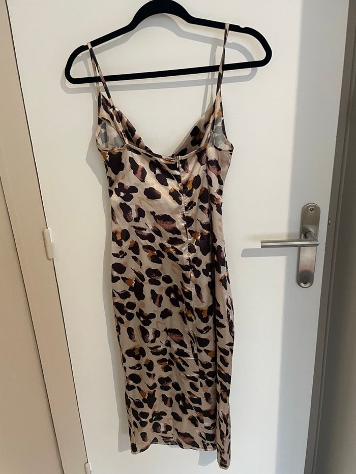 Description : robe longue couleur léopard - style en soie satiné Taille / pointure : M Couleurs : brun beige marron Détails : motifs léopard Marque : aucune Défauts : Peu porté