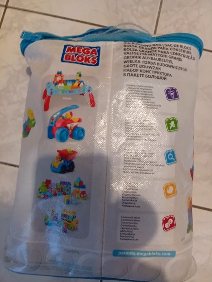 60 pièces, Âge recommandé à partir de 1 an Juste le sac qui est craqué sur le haut, mais n'empêche pas de contenir les pièces .