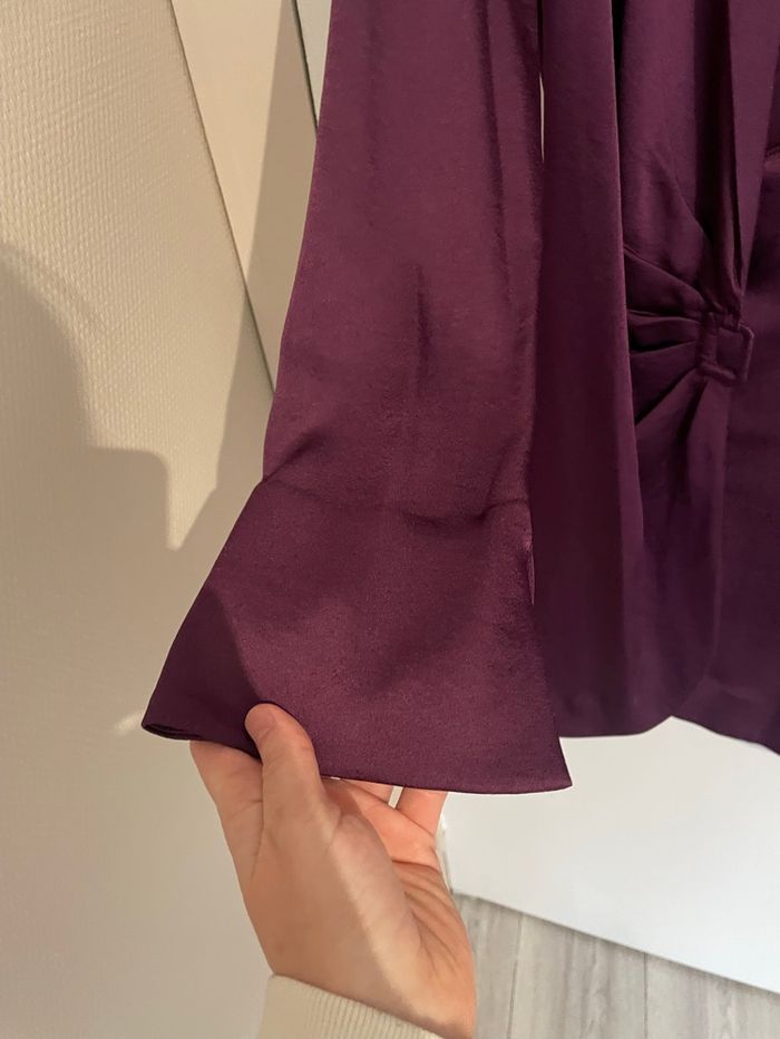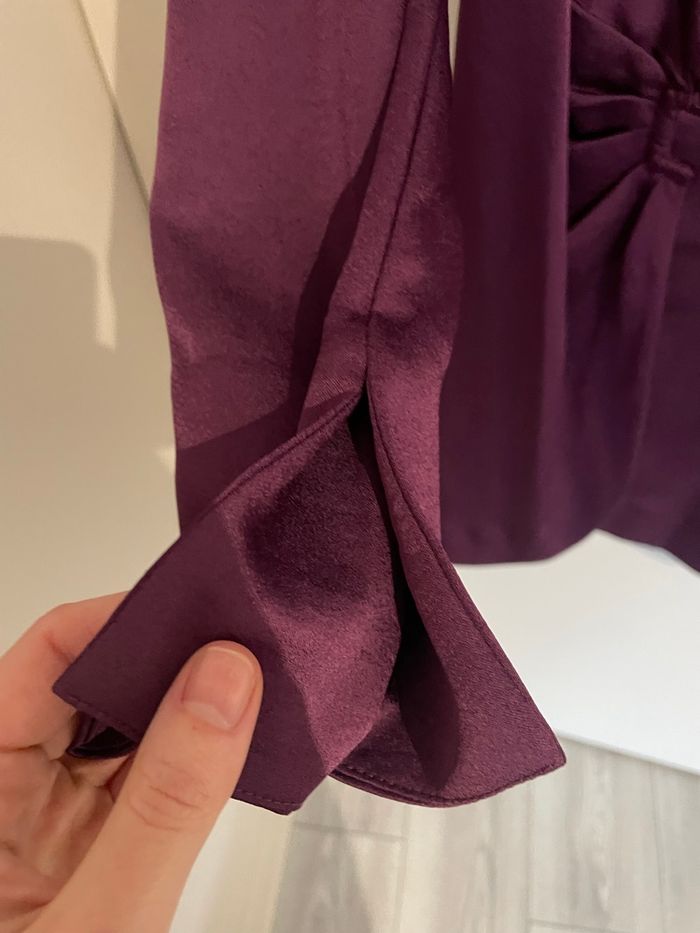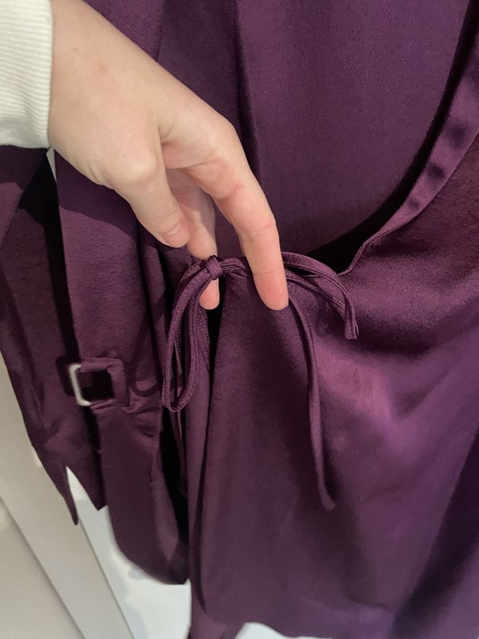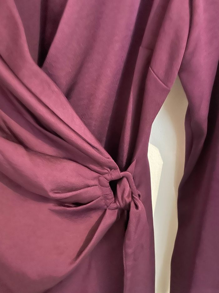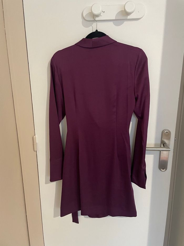 Description : robe de soirée ou cocktail courte - style en soie satiné Taille / pointure : M Couleurs : violet Détails : cache cœur et noue à la taille Marque : aucune Défauts : Peu porté