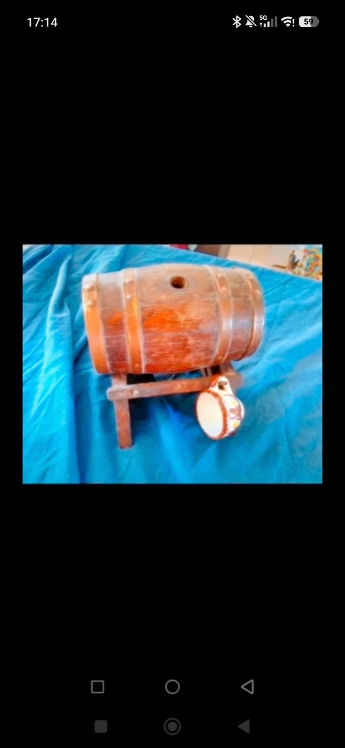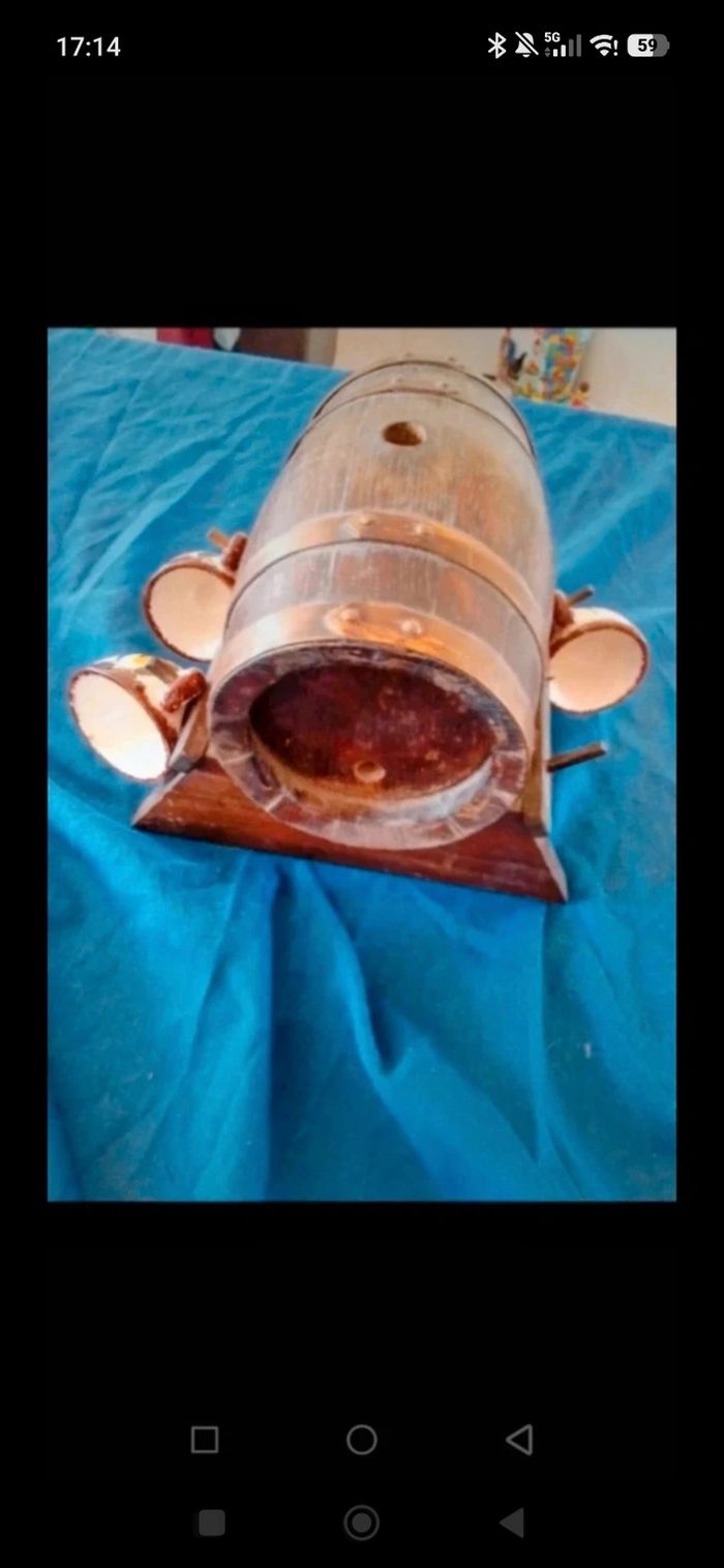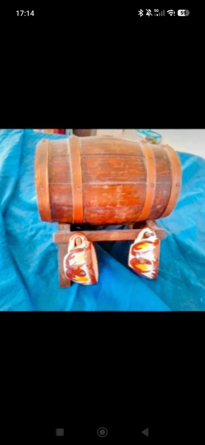 Petite barrique en bois,avec son support et 3 tasses( il en manque une) Très bon état
