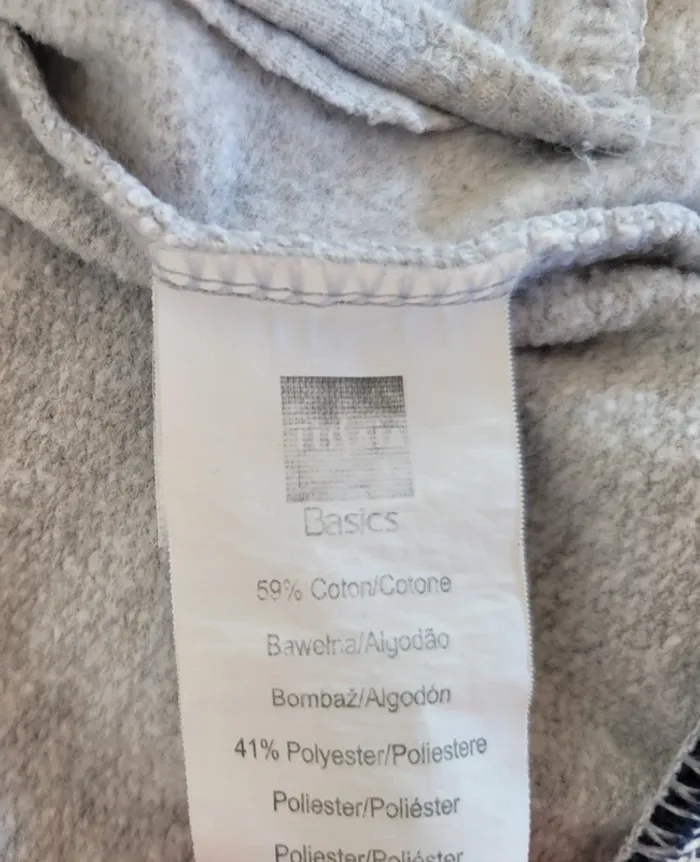 Gilet zippé à capuche Gris chiné Liserés bleu marine au niveau des poignets et du bas du gilet 59% Coton, 41% Polyester