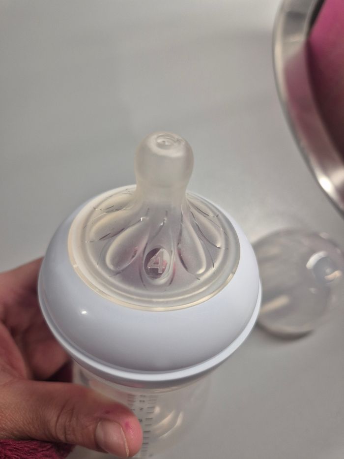 Lot de 2 biberons philips avent neuf juste sterilisé mais jamais servi avec 2 tetine debit 2 neuve et debit 4 peu servi mais tres légèrement jauni