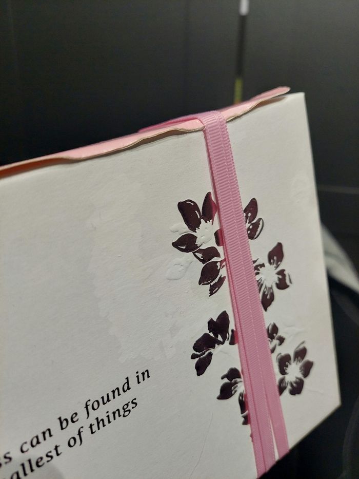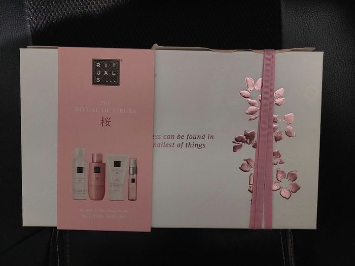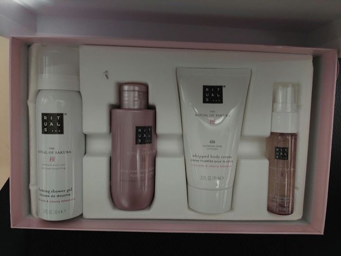Coffret neuf mais abîmé, j'ai remis du marqueur blanc où il y avait des taches. La boite est un peu abîmée Mousse et huile de douche, crème pour le corps et brume pour les cheveux et corps