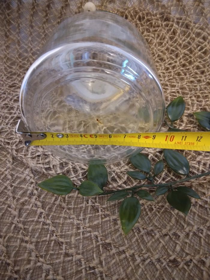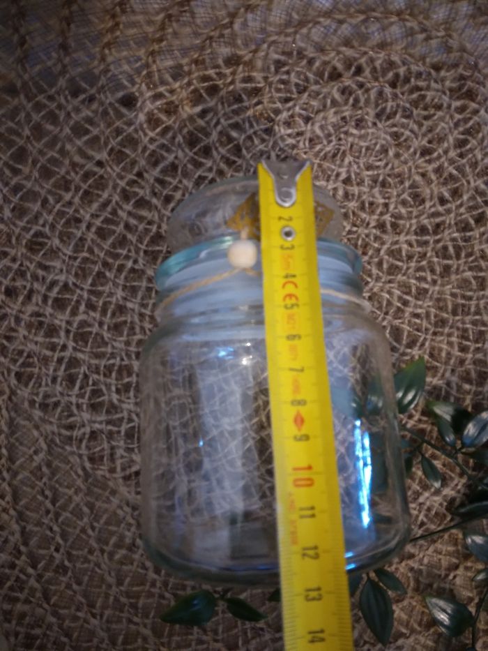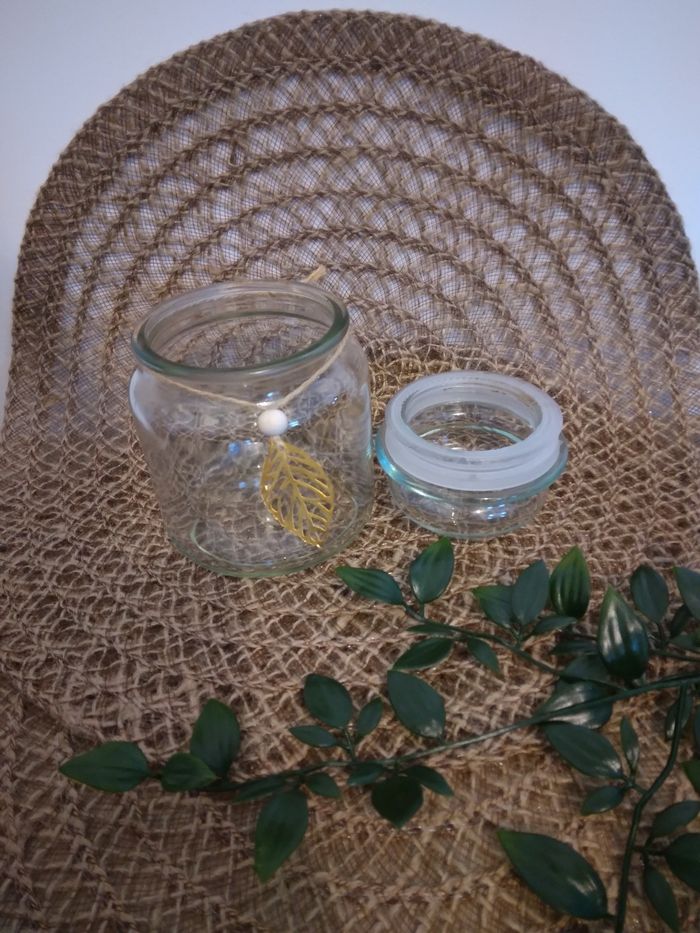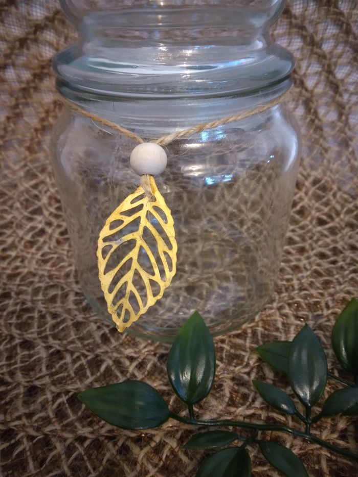 Petite bonbonnière en verre. Décoration avec une feuille en métal doré Dimension: 10cm de largeur et 14cm de hauteur
