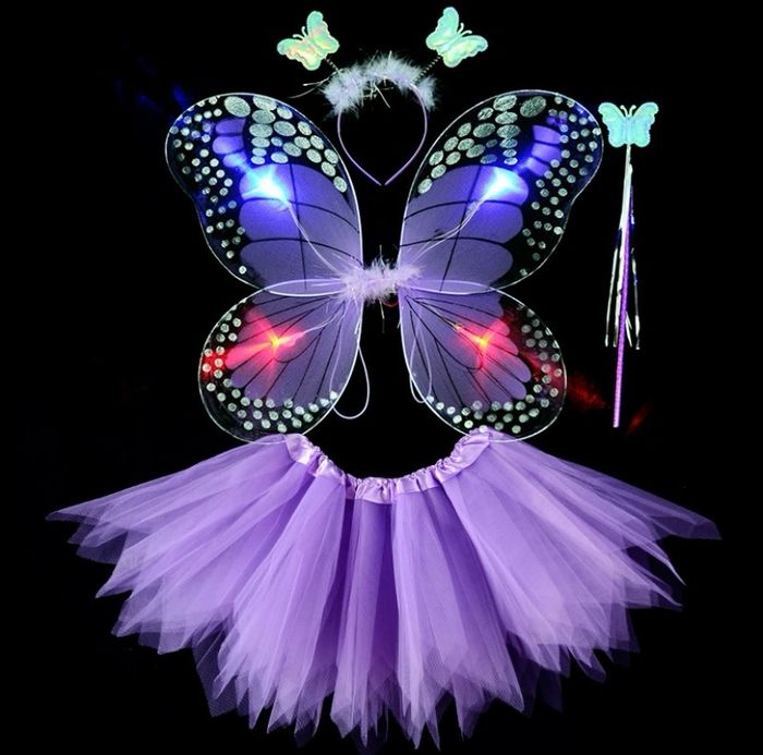 Déguisement papillon violet à LED composé de 4 pièces ; une jupette, les ailes de papillon (élastique à enfiler), une baguette et un serre tête. Jupe tutu élastique. Taille unique, convient aux petites filles de 3-6ans. Vendu dans leur pochette d’emballage d’origine, idéal pour faire un cadeau ! Expédition rapide après votre commande.