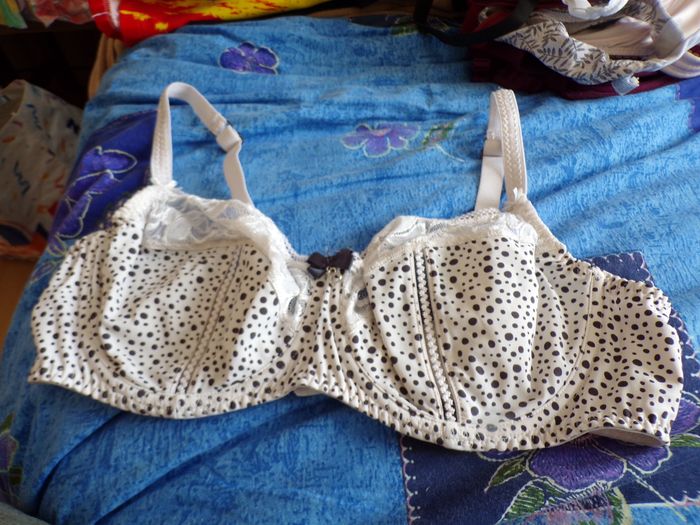 Soutien gorge blanc à pois noirs. Il manque l'étiquette mais c'est un 100C, marque Bestform. Très bon état.