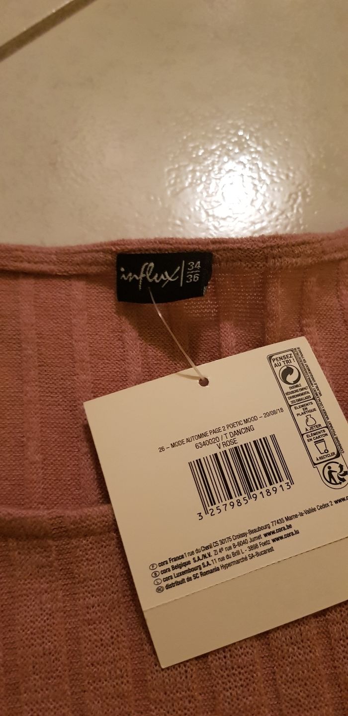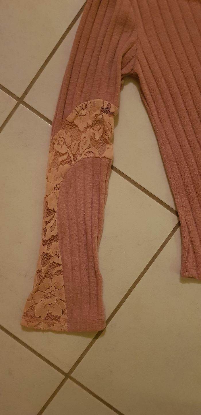 Pull côtelé rose pastel Taille 34/ 36 Manches avec dentelle En 97w% polyester et 3% elasthanne Neuf avec étiquette