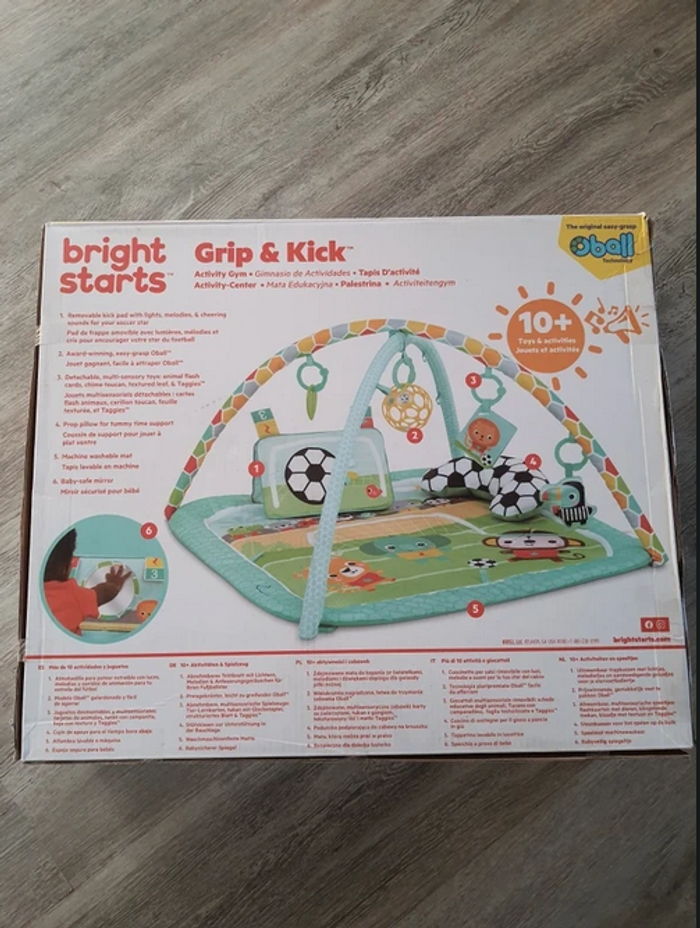 Tapis d éveil bébé football avec jouets Oball avec musique et musique et lumière L innovante technologie Oball fait son entrée sur le terrain de foot d éveil ludique et évolutif pour les petits sportifs Coussin de support ergonomique spécialement conçu pour la position sur le ventre Allongé sur le dos , assis , ou en mode nomade , bébé évolue à son rythme dans un espace sécurisé et stimulant L arche de jeu est munie de 4 jouets détachables et repositionnables Une balle oball souple et facile à manipuler , un toucan carillon , des cartes avec des chiffres et animaux et un jouet de dentition en forme de feuille Et ce ´ est pas tout un support de jeu avec lumière et musique déclenches par les mouvements du pied et de mains de bébé Il y a un miroir pour la découverte de son image Léger et pliable et lavable en machine Neuf