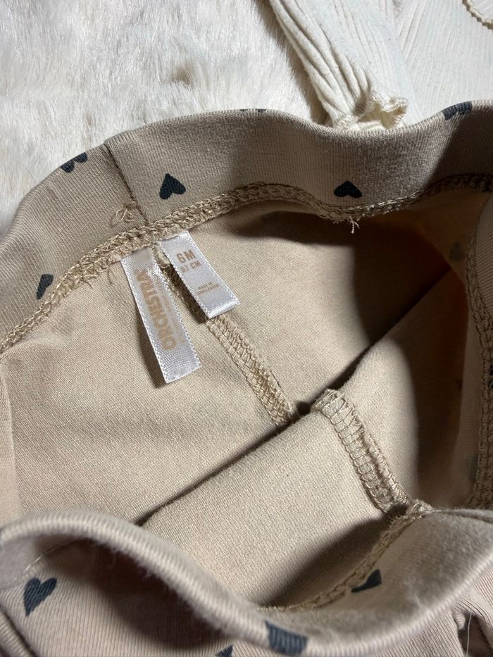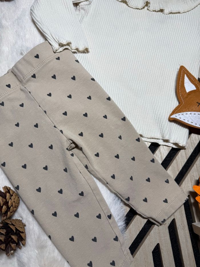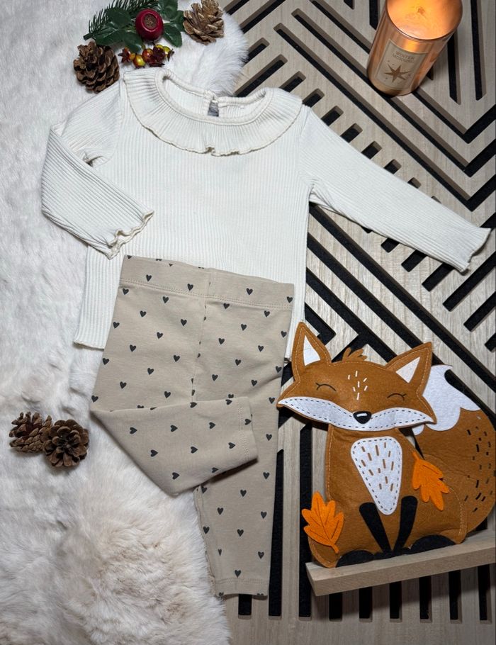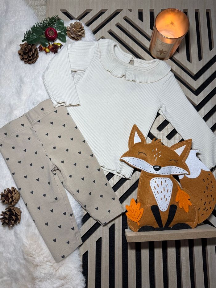 Ensemble Orchestra bébé fille composé d’un legging beige à motif cœur noir 🖤 & d’un pull fin / t-shirt manches longues a col volanté. Taille 6 mois Très bon état