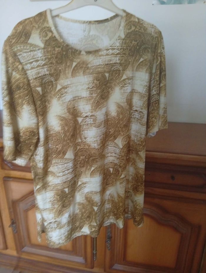 haut manche courte ..95 % polyester 5 % lycra ..taille 42 couleurs doré .51 cm d'aisselle a aisselle .66 cm de long ..sans marque ..⚠️Pas de photo portées⚠️
