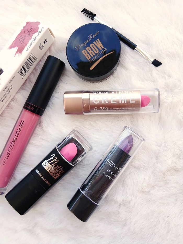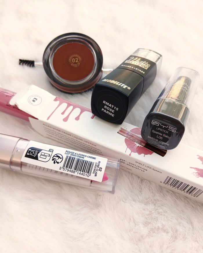 Lot maquillage - Gloss, rouges à lèvres, crème sourcils • Gloss / Brillant à lèvres : N°3 Allen show, longue durée, waterproof, crémeux, hydratant ➥ Neuf • Rouge à lèvres Matte Show Modelite : N°15 rose parme ➥ Juste swatché • Rouge à lèvres Bys : N°L05 velouté prune bohème ➥ Neuf • Rouge à lèvres Crème Modelite : N°2 rose clair ➥ Juste swatché • Crème à sourcils avec brosse Dragon Ranee : N°2 brown ➥ Juste swatché ➥ Possibilité de vendre le lot à l'unité (annonces à l'unité visible sur mon profil)