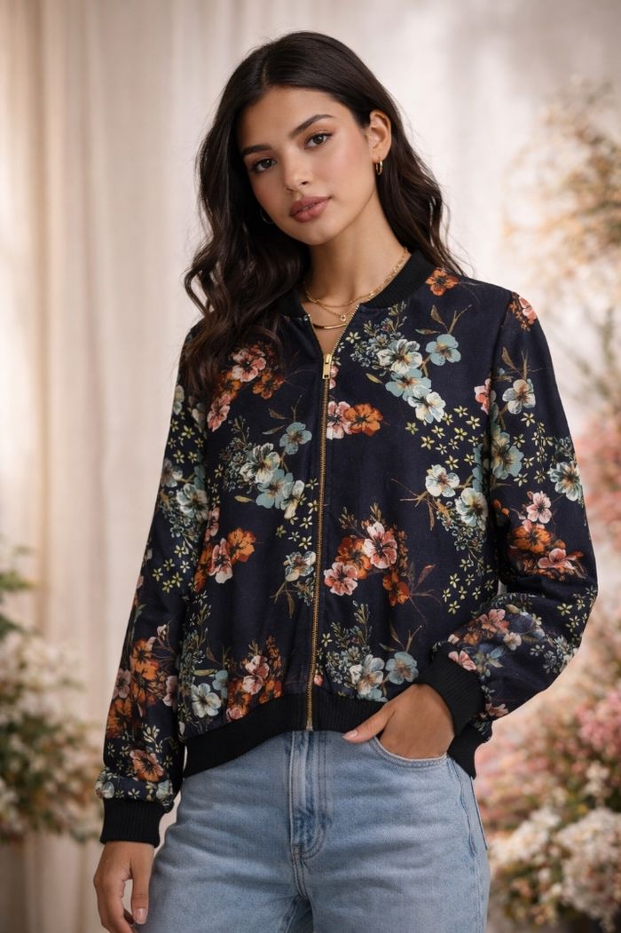 Très jolie veste type bomber, imprimé floral sur fond bleu marine. Coupe tendance et féminine, facile à porter au quotidien comme pour un look plus habillé. 🔹 Fermeture zippée 🔹 Bord-côtes noirs aux poignets, col et bas 🔹 Motif fleurs (tons rose, orange, bleu) 🔹 Style moderne / mode
