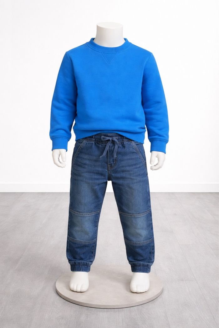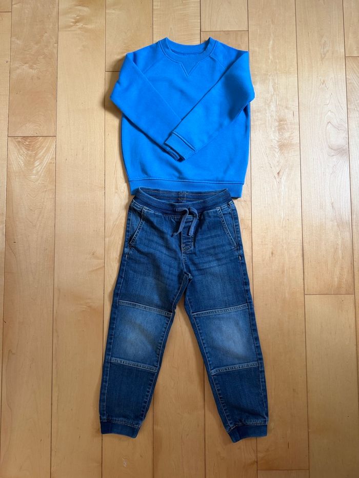 Regardez mes autres articles et mes autres lots et faites de très bonnes affaires avec des articles de qualité et de marque ! Je propose ici un look décontracté composé de : - un jean large brut délavé de chez H&M en taille 5/6 ans, 100% coton - un sweat bleu clair de chez Primark, en taille 5/6 ans N’hésitez pas ! N’hésitez plus !