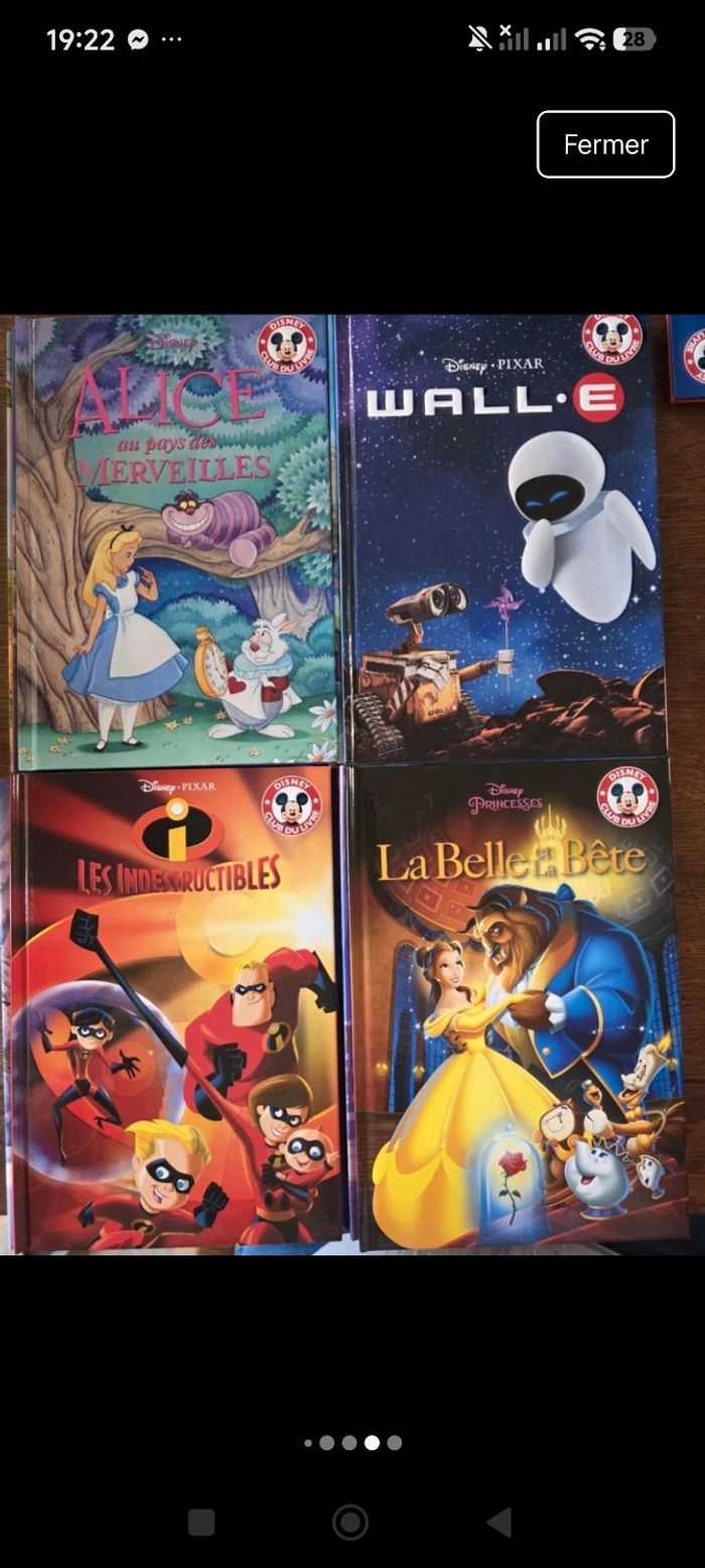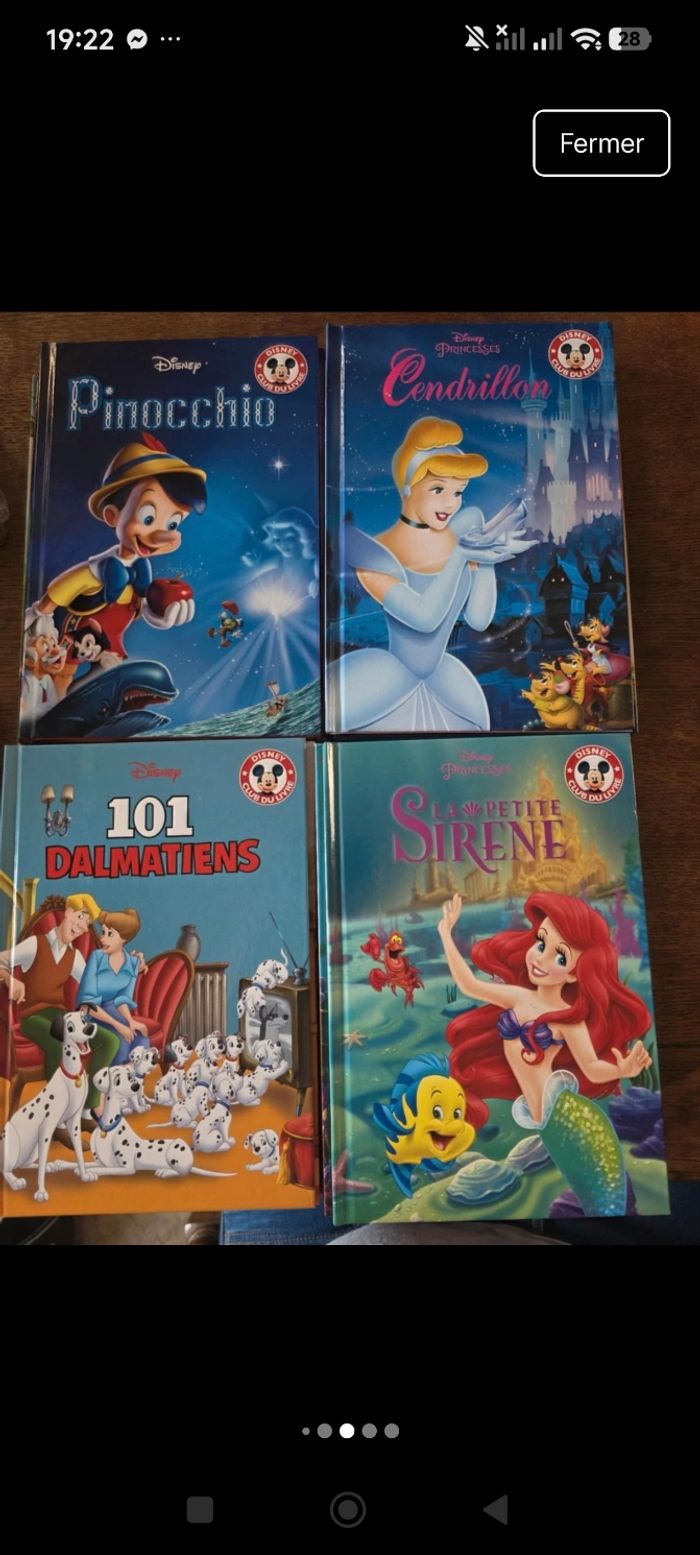 Bonjour ! Je vends ce magnifique lot de 24 grands livres cartonnés de la collection "Disney Club du Livre". Parfait pour des heures de lecture et d'histoires du soir avec les classiques de Disney et Pixar. Les livres sont en excellent état, quasiment neufs. Pas de pages cornées, de déchirures ou de gribouillages. Idéal pour un cadeau ou pour commencer une superbe collection ! Le lot comprend les 24 titres suivants : * Aladdin * Alice au Pays des Merveilles * Cendrillon * Dumbo * La Belle et la Bête * La Fée Clochette * La Petite Sirène * La Reine des Neiges * La Reine des Neiges : Une Fête Givrée * Le Livre de la Jungle * Le Roi Lion * Le Voyage d'Arlo * Les 101 Dalmatiens * Les Aristochats * Les Indestructibles * Pinocchio * Cars * Cars 2 * Le Monde de Nemo * Toy Story 3 * WALL-E * Winnie l'Ourson et l'arbre à miel * Winnie l'Ourson et les abeilles géantes * Winnie l'Ourson et le jour de la tempête Maison non-fumeur et sans animaux. N'hésitez pas si vous avez des questions ! Catégorie : Divertissement -> Livres -> Enfants & jeunes Marque : Disney État : Très bon état Prix par livre 3.12€ Hashtags à ajouter pour la visibilité : #livreenfant #disney #livredisney #clubdulivre #lotlivres #histoiredusoir #collectiondisney #cadeauenfant #reinedesneiges #roilion #pixar #winnielourson