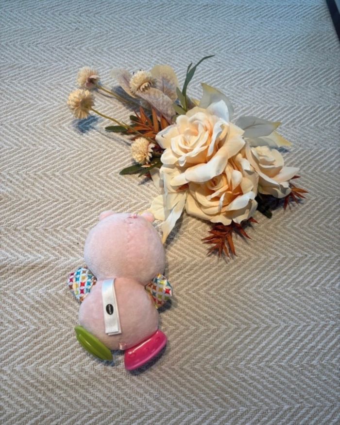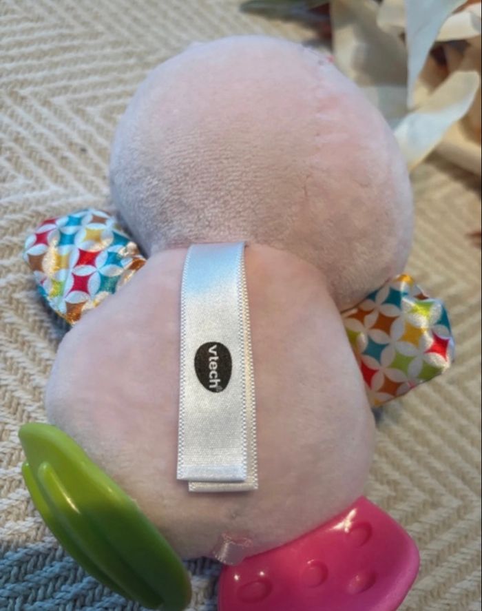 magnifique petite peluche parfait pour les premier mois de bébé malheureusement le plastique est un peu déformer il est passer au séchoir hésitez pas à faire un lot pour profiter des réduction.