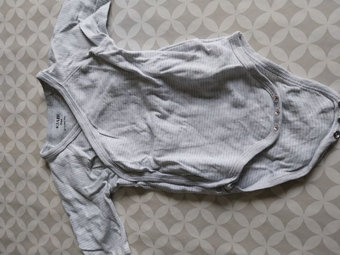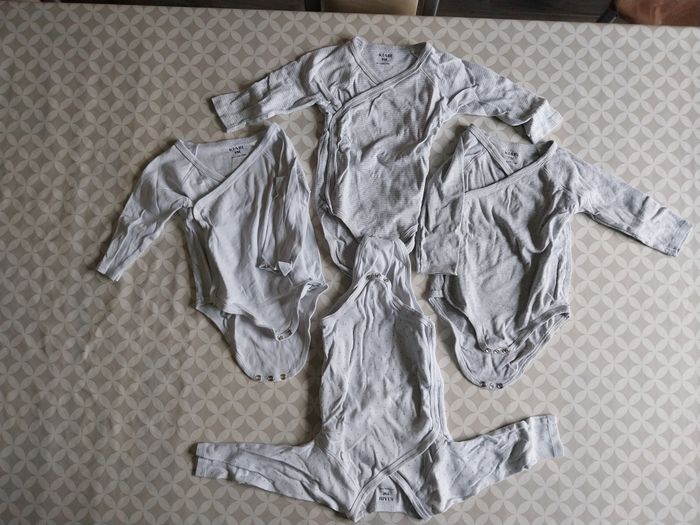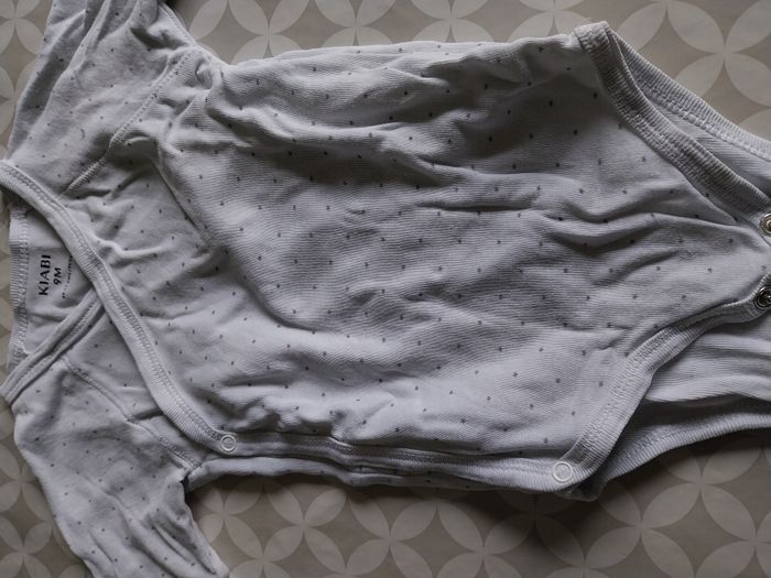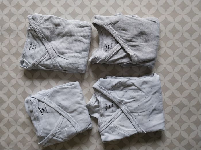 Lot de 4 bodies bébé Kiabi en excellent état, propres et sans aucune tâche. Idéal pour le quotidien, doux et confortables. Détails : • Taille : 9 mois (69–72 cm / env. 9 kg) • Manches longues • Col croisé (pratique pour l’habillage) • Couleurs : blanc et gris clair, motifs variés • Matière : 100 % coton • Marque : Kiabi 🏡 Maison non fumeur 🚚 Envoi rapide et soigné. 👉 Possibilité de lot, regrouper les achats pour réduire les frais de port et bénéficiez d’une remise