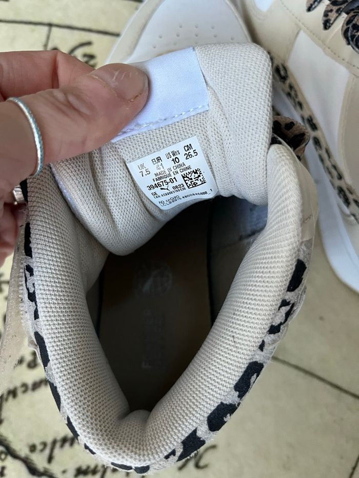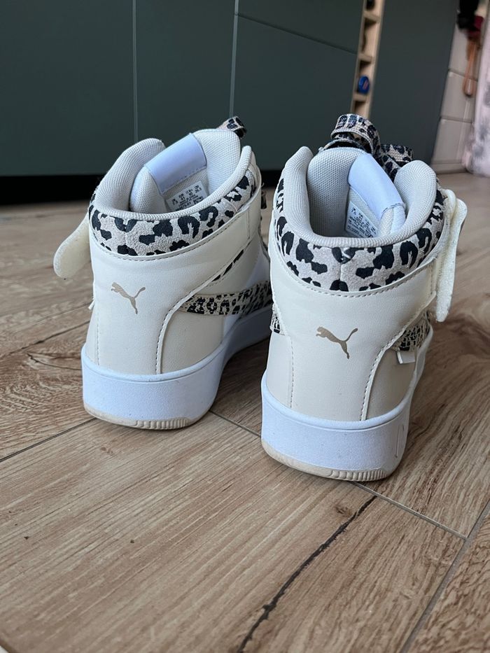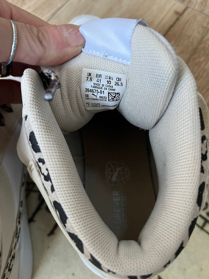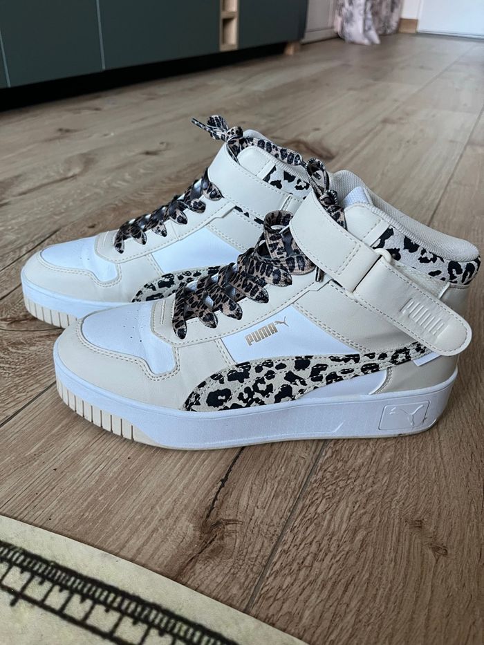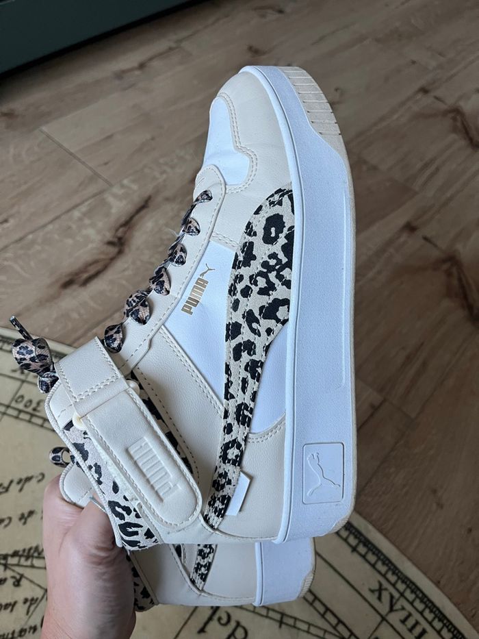 Paire de Sneakers PUMA mi-hautes, à imprimé ANIMAL CARINA STREET femme. Référence 395675-01. Taille EUR 41. -> Elles ne sont pas neuves, ont déjà été (très peu) portées et sont en état excellent. Une paire de lacets blancs vous sera fourni avec, ainsi que sa boîte d’origine.