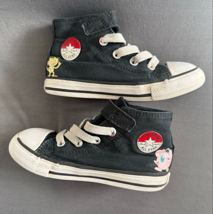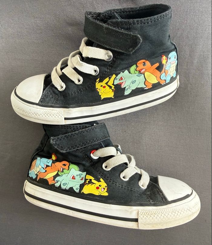 Converse Edition Limitée T 24 × Pokemon baskets Chuck Taylor All-Star Ces Converse sont une Édition Limitée et faites pour les 25 ans de Pokémon par Converse All Star Couleur noire et multicolore avec les différents dessins imprimés de Pokémon Pikachu, Bulbizarre, Carapuce et Salamèche sur un côté des chaussures sur la toile noire Sur l'autre côté patch logo Converse All Stars, X dessin de Miaouss sur une et dessin de Rondoudou sur l'autre avec : - Bout rond, fermeture à lacer sur le devant, hauteur cheville, semelle intérieure à logo. Avec une impression de poudre numérique sur tout noir, un casting de Pokémon du premier partenaire prend le contrôle de la toile classique et complète : - Des détails personnalisés comme le patch de cheville Poké Ball, l'œillet supérieur et le graphique de la languette Pokémon. Très bon état