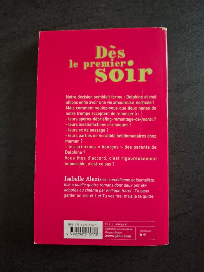 Roman Dès le premier soir de Isabelle Alexis en très bon état Éditions J'ai lu Pas de compromis, pas d'engagement, la liberté totale. Delphine et Elise n'ont pas renoncé à s'amuser. Pourtant, elles songent sérieusement à se caser. À 35 ans, il serait peut être temps d'avoir une vie normale. Mais c'est quoi au juste une « vie normale » ? Un fiancé ? Des projets (avec le fiancé) ? Un foyer (encore avec lui) ? L'amour avec un grand A ? Ou l'ennui avec un grand E ? La question mérite réflexion. Et si c'était le début de la fin ? Entre Sex and the City et Bridget Jones, le portrait tendre et désopilant de deux futures ex-célibataires, une irrésistible comédie sur la trentaine et l'amour..