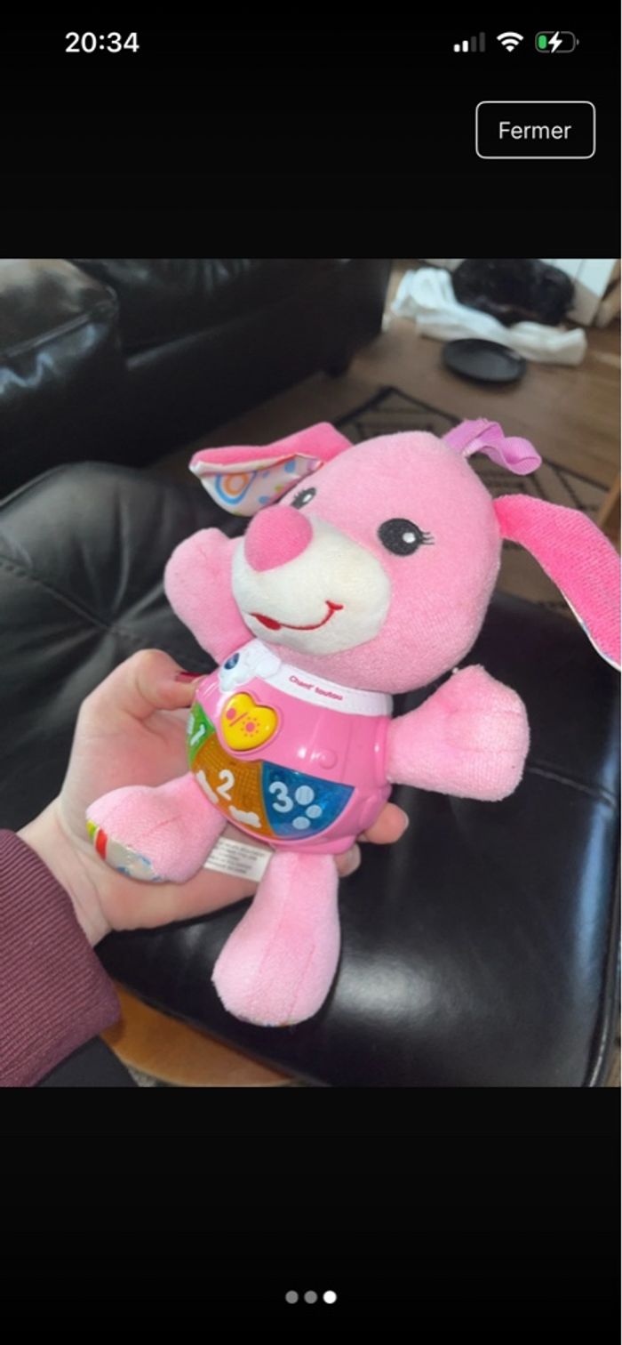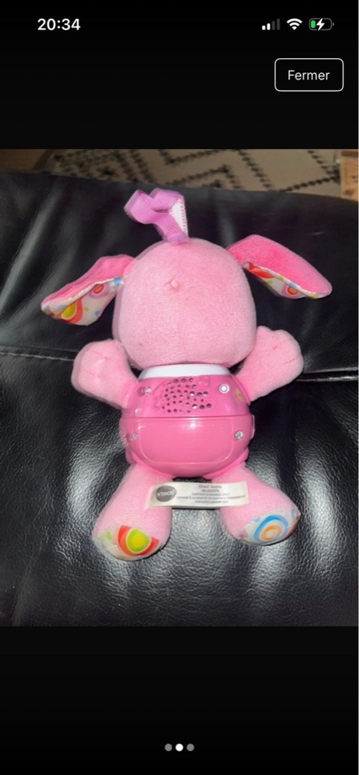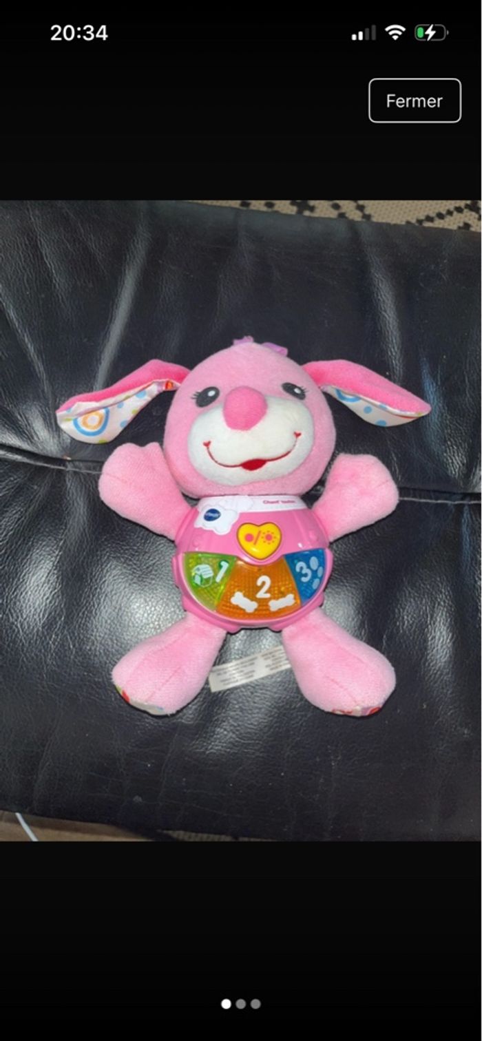 Peluche interactive douce avec voix et mélodies Avec ses boutons lumineux, il enseigne les chiffres, les objets et joue des mélodies douces Ses différentes textures stimulent le sens du toucher du bébé Dispose d'une bande Velcro pour l'accrocher au berceau, à la poussette ou à la poussette. Très bon état