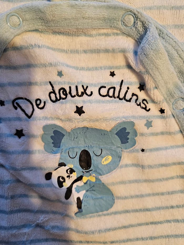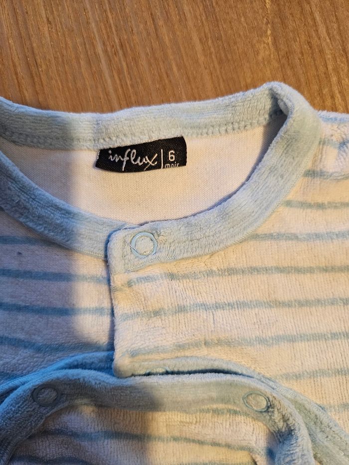 Pyjama en velours blanc rayé bleu clair Marque influx Taille 6mois Bon état, l'image se décolle un peu