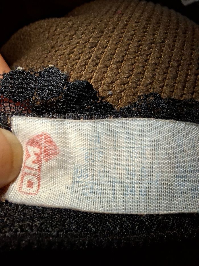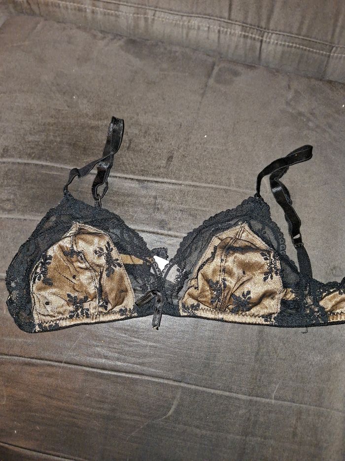 Vends ce joli soutien-gorge de la marque DIM, modèle triangle sans armatures pour un confort optimal et un galbe naturel. ​Taille : 85B ​Design : Alliance chic d'une dentelle noire travaillée et d'un tissu satiné de couleur doré/bronze. ​Finitions : Bretelles réglables, fermeture par double agrafage (3 positions), petit nœud satiné à l'entre-sein. ​État : Bon état général. L'étiquette de composition est un peu effacée mais le soutien-gorge est parfaitement entretenu.