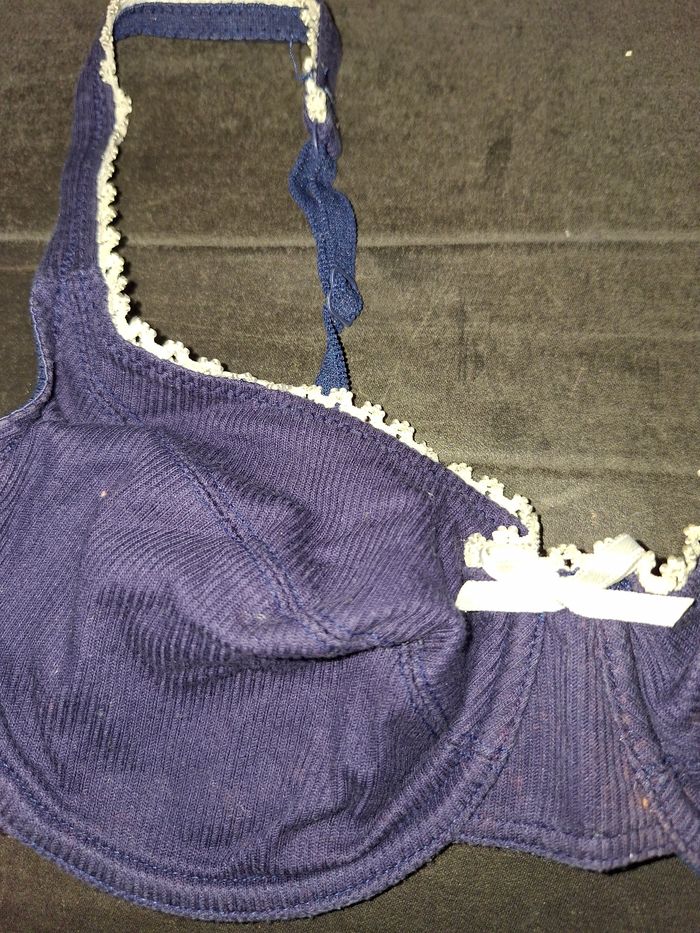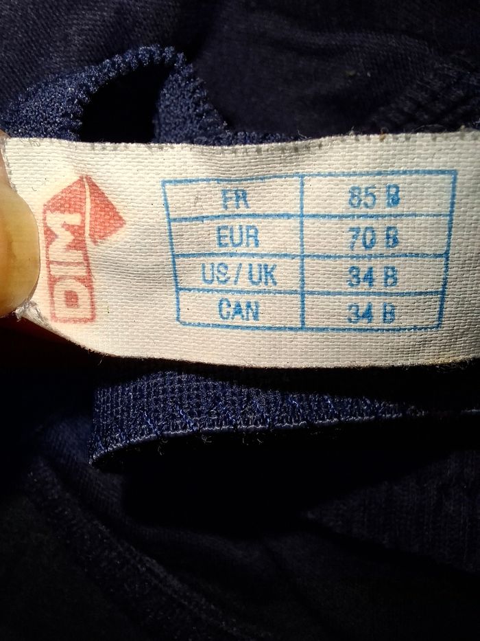 Vends ce soutien-gorge ultra-confortable de la marque DIM, idéal pour le quotidien. ​Taille : 85B (FR) / 70B (EUR) / 34B (US/UK). ​Matière : 100% Coton (hors garnitures), une matière douce et respirante. ​Couleur : Bleu marine avec une délicate bordure en dentelle écrue/blanche. ​Détails : Modèle avec armatures pour un bon maintien, petit nœud décoratif blanc à l'entre-sein, et maille finement côtelée. ​État : Bon état général. Les agrafes et le tissu sont bien conservés (voir photos). ​Le petit plus : Parfait pour celles qui recherchent un maintien naturel sans sacrifier le confort du coton.
