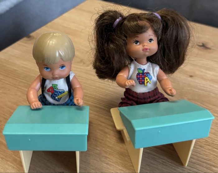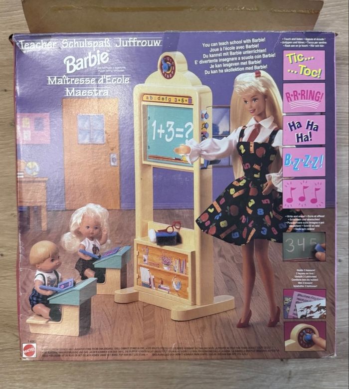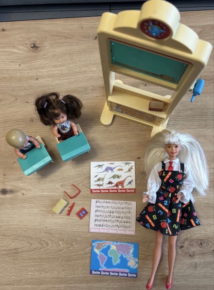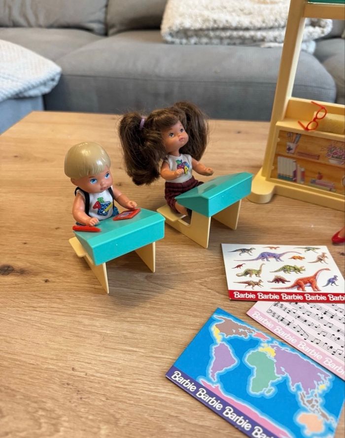 Fonctionnel. Le tableau électronique fonctionne parfaitement. Laissons son opérationnel testé contenu poupée Barbie maîtresse avec sa tenue d’origine, deux poupées enfants élèves tableau et pupitre interactif deux bureaux d’élèves. Carte pédagogique géographique musique, dinosaures lunettes gomme accessoires, visible sur les photos boîte d’origine et notice. à noter, il manque une clé et un cahier en très bon état général, boîte d’origine complète avec des traces d’usure.
