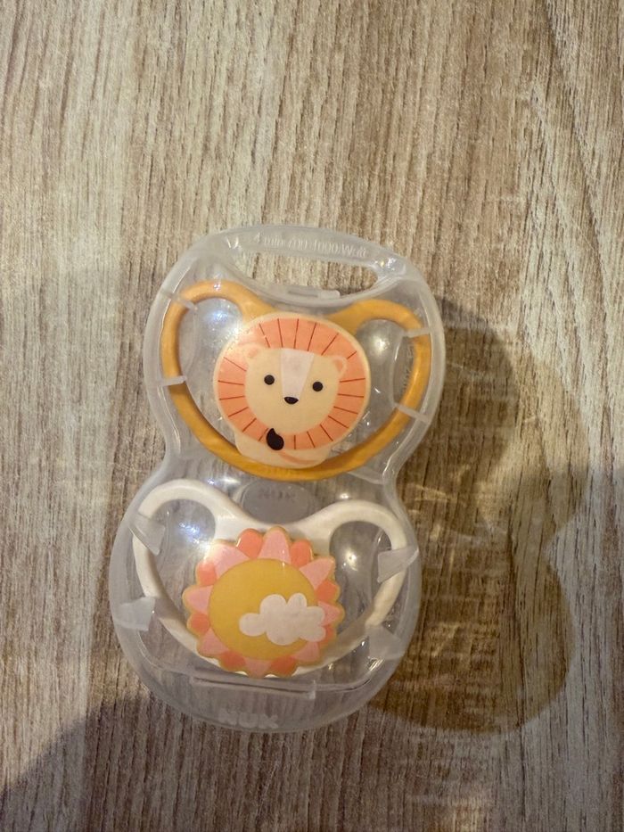 Lot de 2 sucettes NUK Taille 6-18 mois Neuve, jamais porté, vendu avec sa boîte de stérilisation ⭐️ N’hésitez pas à faire un tour dans mon dressing, des réductions s’effectueront automatiquement pour les lots ☺️