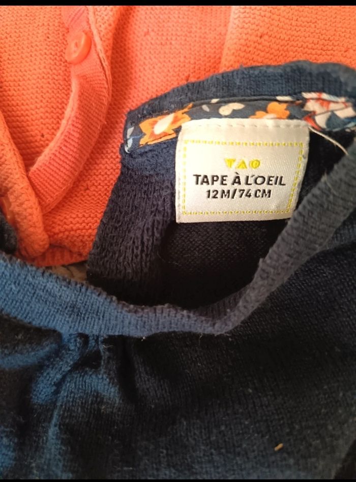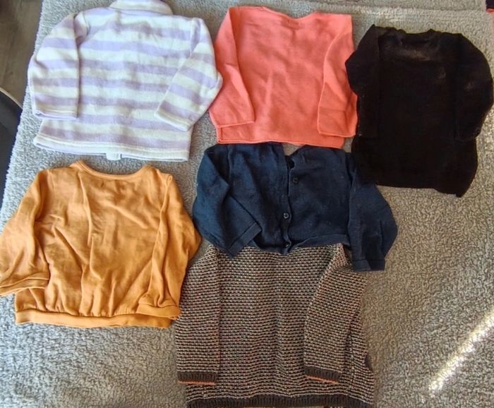 💮5 gilets 💮1 pull 💮12 mois 💮Très bon état 💮 Différentes marques (barbouillage, Kiabi, verbaudet, TAO, baby club)