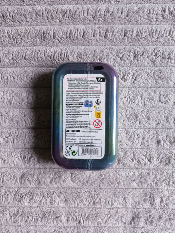 Coffret collector Mini Tin EV8.5 Évolutions Prismatiques – Pyroli de l'extension Écarlate et Violet ! Une des 8 boîtes des Évolutions d'Évoli, idéales pour les collectionneurs. Contenu exact : 2 boosters Écarlate et Violet – Évolutions Prismatiques 1 carte artistique exclusive Pyroli (illustration assortie à la boîte) 1 pièce à l'effigie d'Évoli