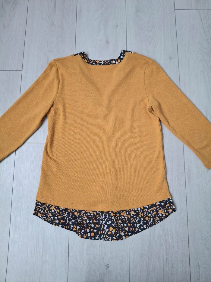 Pull col V, manches 3/4. Bi-matière, col effet chemisier. En très bon état.