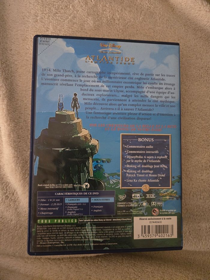 Je vends le film d'animation Disney "Atlantide : L'empire perdu" en DVD. - Type de produit : DVD - Titre : Atlantide : L'empire perdu - Type de contenu : Film d'animation - Édition : Version classique - Langues audio : Français, Anglais - Sous-titres : Français, Anglais - Bonus inclus : Commentaires audio, Commentaires interactifs, Disneyp??dia, Making-of, Galerie de dessins Très bon état. Le DVD ne présente aucune rayure ni défaut. N'hésitez pas à me contacter pour toute question supplémentaire.