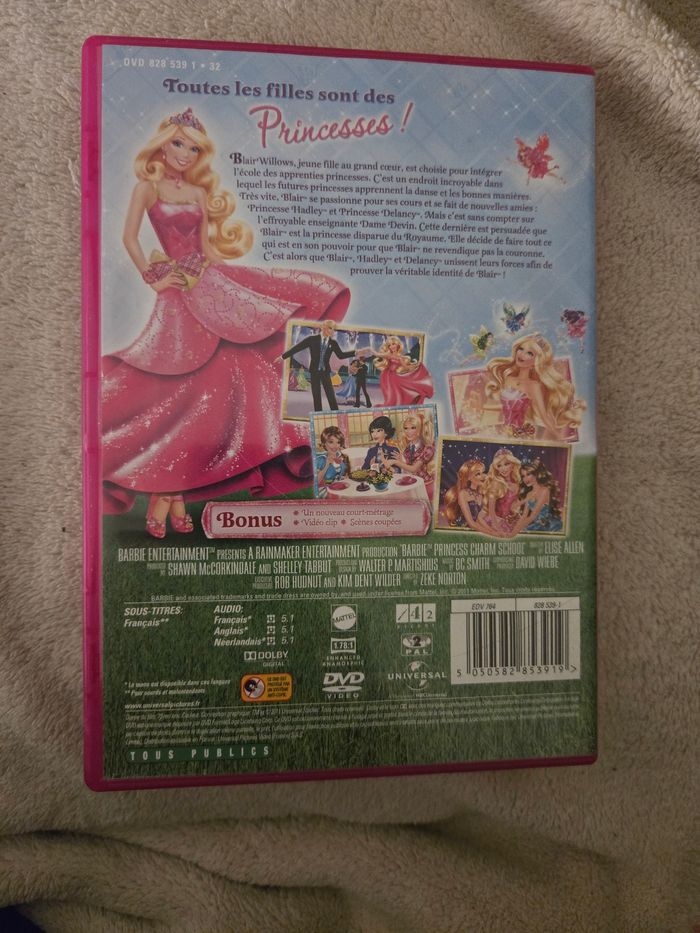 Je vends le DVD du film "Barbie : Apprentie Princesse", un film d'animation Barbie mettant en scène l'histoire d'une jeune fille qui rêve de devenir princesse. - Type de produit : DVD - Titre : Barbie : Apprentie Princesse - Type de contenu : Film d'animation - Bonus inclus : Scènes supplémentaires Très bon état, le DVD n'a aucune rayure ni marque d'utilisation. N'hésitez pas à me contacter pour plus d'informations !